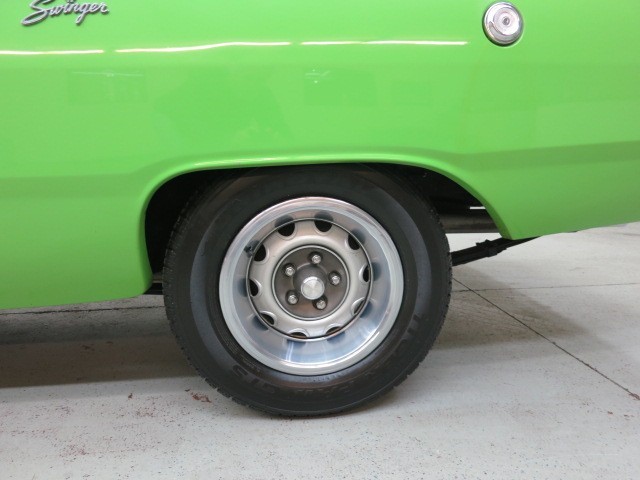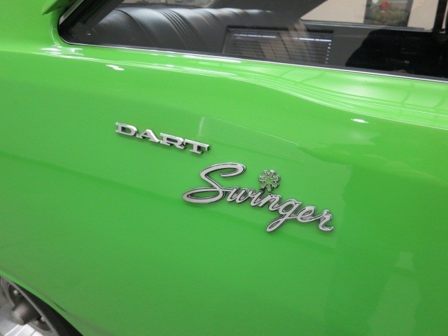 * Model History : The Swinger name was applied to all the Dart two-door hardtops except in the high-line Custom series. A number of other changes were made to the Dart line to avoid internal competition with Dodge's new Challenger: the Dart convertible was discontinued along with the optional 383 cu in (6.3 L) V8, leaving the 275 bhp (205 kW) 340 Torque / 340 C.I. 4-barrel V8 as the top Dart engine.[5] The performance model in the Dart line for 1970 was the Swinger 340 2-door hardtop. The 1970 Swinger 340 came with functional hood scoops with 340 emblems. Standard equipment included front disc brakes (only on the Swinger),[25] heavy duty "Rallye" suspension, a 3.23:1 rear axle ratio, fiberglass-belted bias-ply tires mounted to 14" x 5 1/2 " steel wheels, and a bumble bee stripe. Optional equipment included an upgrade over the standard bench seat with all-vinyl bucket seats, with which a center console could be ordered. A performance hood upgrade with scoops was painted flat black with hood tie-down pins. Mechanical options included power-assisted brakes and steering. Rallye wheels and wire wheel covers were also optional, as was a 6000 rpm tachometer and a vinyl roof covering in black or white.