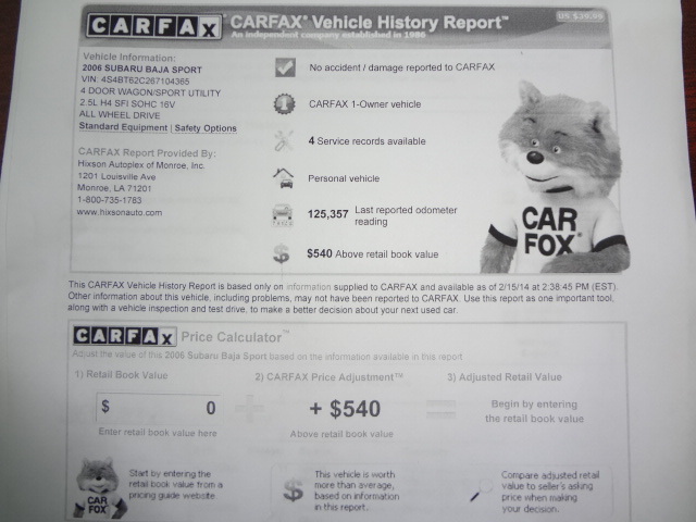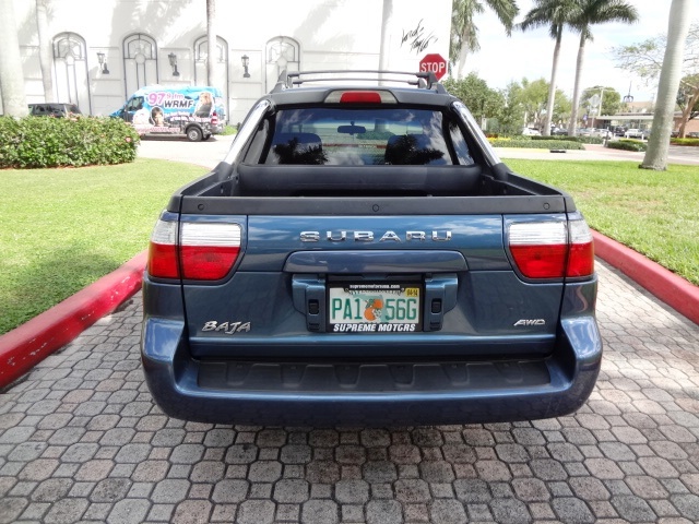You are looking at a Gorgeous 2006 Subaru Baja Sport Automatic All Wheel Drive 4x4 with Power Sunroof. This is a Rust Free Florida Vehicle with a Clean Carfax, Clean Autocheck, and Clean Florida Title. This car has been well kept and well maintainted. This Subaru is a 1 Owner-Smoke Free Beauty. This vehicle runs and looks awesome. This Subaru needs nothing at all. It's ready to go today. Please take a look at the variety of photo we have in the description and you can see for yourself how nice this Baja really is. These cars are rare and hard to come by in this condition. The bed folds down to make this truck very versatile. You can go anywhere with this baby. We will price this vehicle to sell, so don't hesitate to call now. Please let us know if you have any questions or concerns about this vehicle. We are happy to help at any time. Please call Jeff or Ken at 954-561-2499 or email us at usedcars@suprememotorsfla.com.
