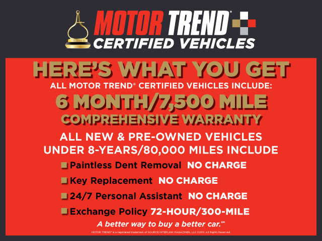 Have you heard about the Motor Trend Certified Advantage? With the purchase of any vehicle under 80,000 miles you will receive a minimum of 6 months OR 7,,500 miles of comprehensive warranty coverage, 12 months of our EasyCare Dent Repair to keep your vehicle looking new, 12 months of EasyCare Key Care to replace those expensive keys and remotes if they?ˆ™re damaged or lost and 12 months of our 24/7/365 EasyCare Personal Assistant Service PLUS many other benefits offered exclusively by Motor Trend of Broward. Send us a message or give us a call now for more information about your next vehicle backed by the best benefits in the industry!