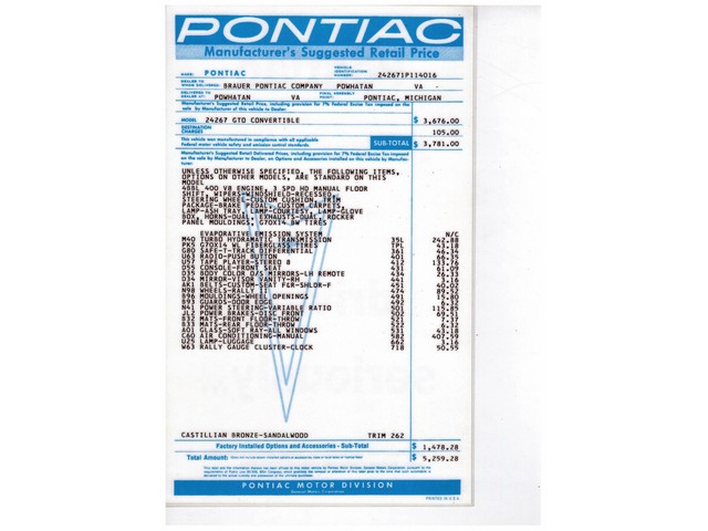 Shipped to Brauer Pontiac in Powhatan, Virginia