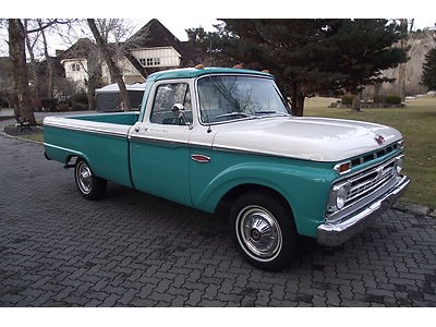 This is an ORIGINAL RESTORED 90,904 Original mile 1966 Ford F100 with the Custom Cab trim package on the outside and inside and as you can see in the pictures it is BEAUTIFUL!! Careful to not let this 1966 jewel get away! What a value it is at the reserve price which is set very low! Take a look at the lines on this beauty, what an amazing looking truck including the Custom Cab Package stainless steel body side moldings. This BEAUTY is one nice driving rig and is in GREAT shape. It is a DRY Oregon vehicle all its life. This truck was built in San Jose California and first sold in Oregon. We bought this truck from the third owner. He spent over $8K on this truck, the lion's share on the rebuild of the engine and transmission.