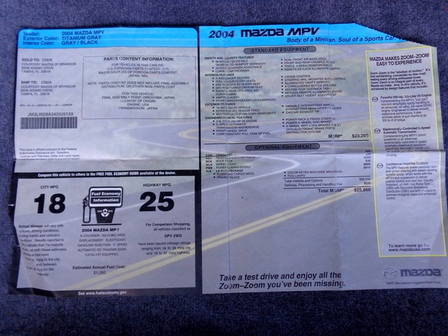 Hello and thanks for stopping by our "No Reserve" auction for this, 1-owner, very well maintained and kept, clean Carfax history, 2004 Mazda MPV LX minivan with 3rd row! Fully inspected and serviced, she is ready to go. According to the Carfax report below, she is $560 above retail book value! Always a Florida vehicle! As you can see in the many detailed photos below, the "Titanium Gray" metallic exterior shines like the Florida sun! She looks nice overall, minimal bug spots. The "Gray" interior is clean, odor free and has no rips or tears. The seats are comfortable cushioning and provide very good support. I have personally driven this van and I was very pleased with its smooth, quiet ride. Third row seats folds down for some very roomy, convenient cargo space. The utmost dependability, excellent for family transportation or a small business! Power for this LX model is provided by a 3.0-liter V6 engine that produced 200 horsepower. The engine runs strong, sounds and feels solid. The engine is linked to a five-speed automatic transmission that shifts gently, never hard shifting. This MPV provides plenty of features, including, power sliding side doors, ice cold front and rear air conditioning, power windows, door locks, mirrors, front airbags, tilt steering wheel with audio and cruise controls, AM/FM/CD stereo system, floor mats, spare tire, jack, tools, roof rack, 4-wheel ABS disc brakes, rear defogger, rear wiper, tachometer, owner's manuals, tinted glass, keyless entry, 12V outlets, 16" alloy wheels, really good condition tires, rear spoiler, satellite radio ready(subscription service), rear door child locks, fog lights, interior fuel release, wheel locks and key, power sliding side windows, 1-owner, clean Carfax and more... This MPV's handling, interior, styling and flexibility all received high marks from drivers. Take a look! All our titles are free and clear from any and all liens. You will receive a clean title. Keep your eyes on this one, we are running this with "No Reserve" that's right!! Set your proxy bids now!! High Bidder Wins!! Good Luck...Please, ask all questions or concerns you may have before you bid and win our auction! Please do not assume anything. We also use our pictures as a physical description so please look at them all. Pre-sale inspections are welcomed and encouraged. Please read our “terms and conditions” below. If you would like a “Buy It Now” price, through eBay, you can contact me, Avi Fraser, via email at surewecanmakeadeal@rollingwheelsinc.com or you can call me, in the office, at 954-527-5522 and I will be happy to help you. We are always willing to negotiate and 4 SURE, WE WILL MAKE A DEAL WITH YOU! We appreciate your interest and want to make sure you have the best possible shopping experience with us. It is our goal to provide great products with excellent service, so if you have any questions about this item, or any other items that we currently have available, please don't hesitate to ask! Have a great day! Visit our location 125 E. Sunrise Blvd. Ft. Lauderdale, Fl. 33304. We are open, M-F, 9am-5pm. Sat, 9am-4pm. Closed Sunday and holidays.