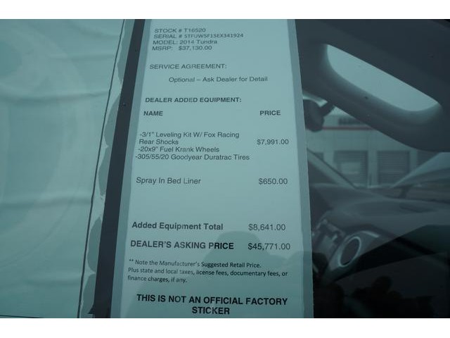 Lifted Tundra DoubleCab 5.7L V8 4WD with SR5 Package, Entune Audio Plus, 18" Alloy Wheels, Carpeted Floor Mats! MSRP is $37,130 + $7,991 lift and wheels + $650 spray in bed liner = $45,771. Sale price is $42,942 - $500 Toyota rebate (in lieu of Toyota Special APR) = $42,442.Offer ends 3/3/14. Come to Toyota of Naperville today!
