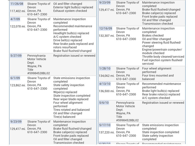 Toyota dealership its entire history.  Second timing belt was changed at 166,576 miles.  See car fax below.