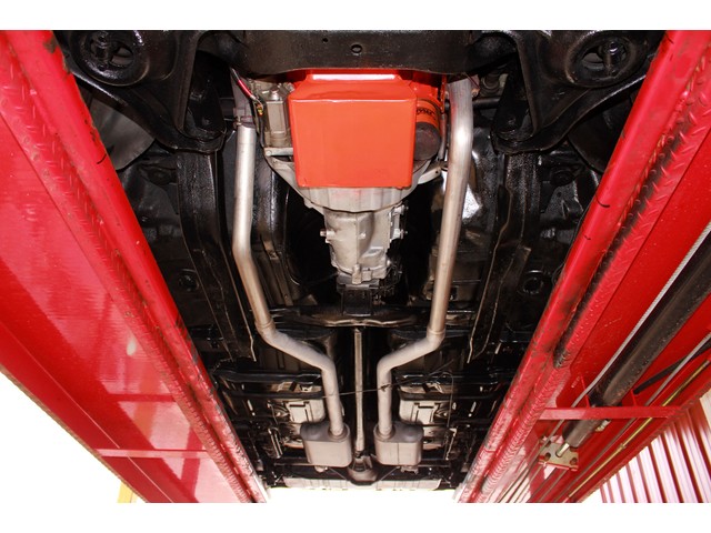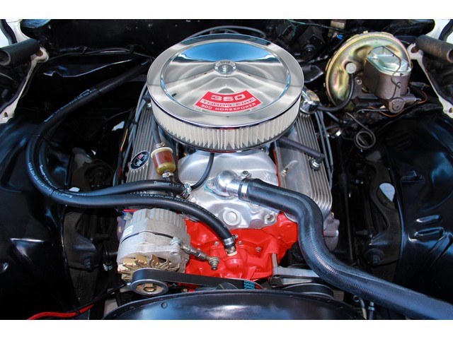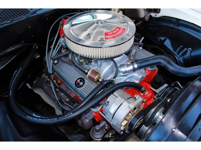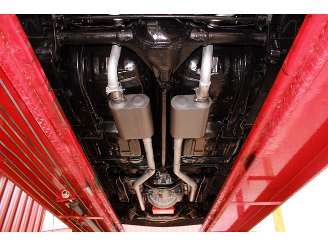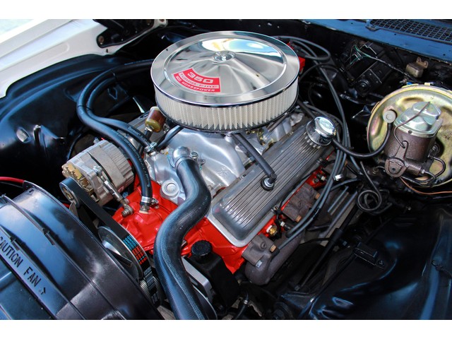 Finally, we will take a look at the heartbeat of the Chevy. Under the hood it has a 350 V8 that is mated to a 4 Speed trans and a 12 Bolt Rear End. The engine is dressed with an aluminum intake with an Edelbrock Carb and chrome breather. When you look at the valve covers they appear to be the GM finned Aluminum. It has the stock manifolds with Flow Master Exhaust. This Z comes with Power Steering and Power Disc Brakes. When you look under it all the floor pans look good with good frame rails and it has the front and rear sway bars.