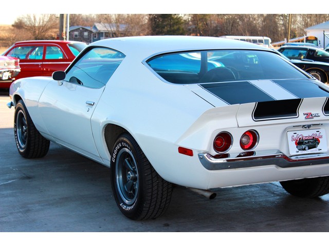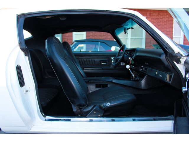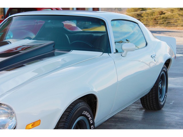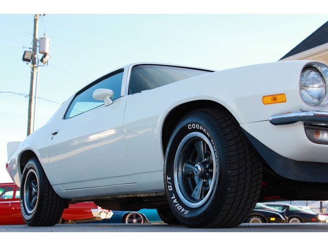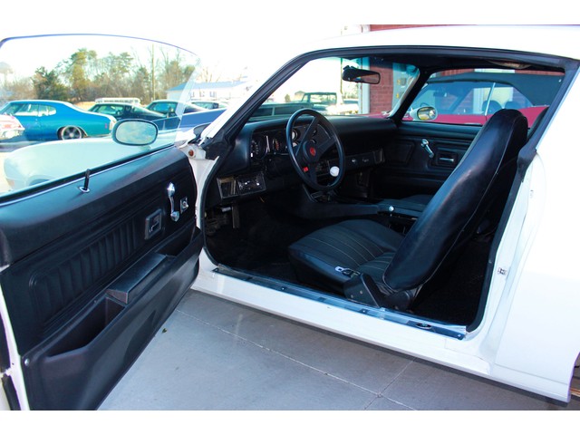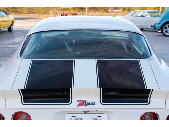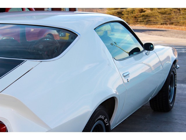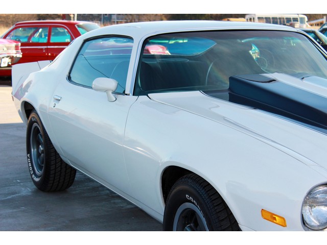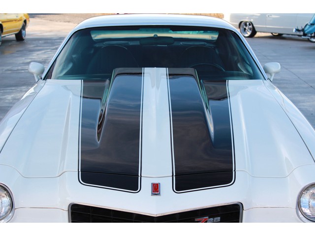 We will start off with the exterior of the Z 28. When you walk around it you will see a killer body with great line that has been fitted with a 2” Steel Cowl Hood along with the front and rear spoilers. Everything is covered in the Dover White Paint that is accented by the Black Stripes which is the correct colors for it. When the repaint was done they used base coat cleat coat and laid the stripes under the clear. It has a slick finish that shows very well. All the chrome appears to be new with the stainless being in very good shape. To keep it with a stock look it’s setting on a set of the factory Rallys with White Letter Tires.