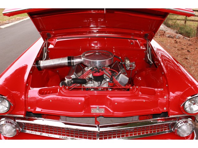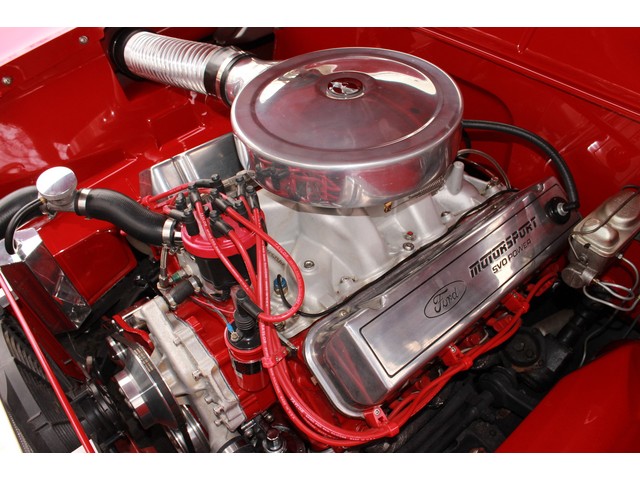 Finally, we will take a look at the driveline of the Ford. Under the hood as with the rest of the car is very clean and neat. All the inner fenders and fire wall is done in the same victory red. The engine is a 429 V8 that is mated to a C6 Trans. It has a lot of add-ons such as the Aluminum Intake, Holley Carb, and Ford Motor Sports Valve covers. To keep it cool on hot days it has Aluminum Radiator and Water Pump. All the pulleys are Billet along with a chrome Alternator. The sound is provided by a set of Short Headers and Flow Master exhaust. To help it stop it has 4 Wheel Disc Brakes. The bottom of this Ford is super solid and well done as expected.