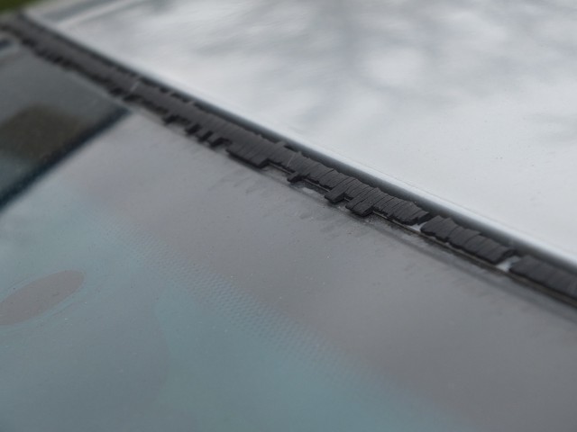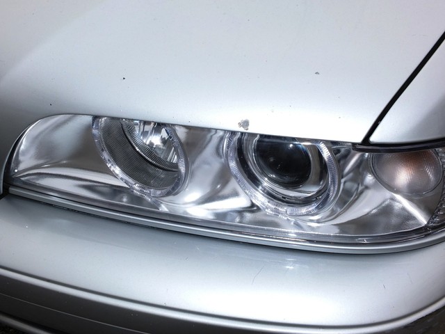 THIS BMW 525i LUXURY SPORT SEDAN HAS A NICE BODY WITH NO RUST AT ALL.  THE PAINT LOOKS GOOD WITH ONLY A FEW ERASER SIZE CHIPS HERE AND THERE (THE CHIPS ARE MAINLY ON THE FRONT END OF THE CAR).  BOTH BUMPERS HAVE SOME DIME-SIZE CHIPS AND SCRAPES, BUT NOTHING MAJOR.  THE ONLY EXTERIOR ISSUE OF NOTE IS A FEW SHALLOW DENTS ON THE FRONT OF THE HOOD AROUND THE RIGHT "KIDNEY" GRILLE.  THE PAINT IS CRACKING THERE IN ONE SPOT TOO (SEE PICS OF THE BLEMISHES BELOW).  OTHER THAN THAT, THE PAINT IS GLOSSY AND LOOKS GOOD OVERALL.  THE RUBBER TRIM AROUND THE WINDSHIELD IS CRACKING BADLY, BUT THERE ARE NO LEAKS AT ALL.