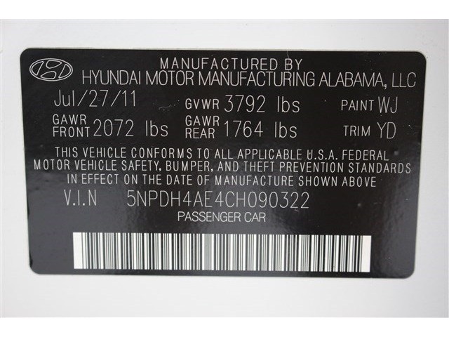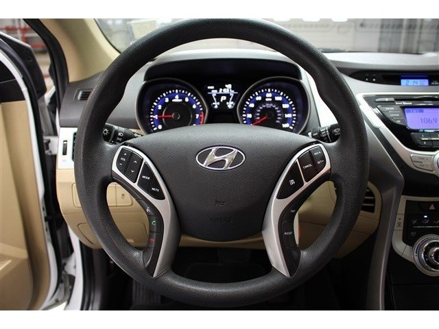Be sure to take advantage of buying this superb 2012 Hyundai Elantra. This Elantra is an amazingly fuel efficient car. No longer will you break the bank when you pull up to the gas pump. It is nicely equipped with features such as 6-Speed Automatic with Overdrive, White, Beige w/Premium Cloth Seating Surfaces, ABS brakes, ABS w/Electronic Brake Force Distribution (EBD), Dual Heated Power Outside Mirrors, Electronic Stability Control, Heated door mirrors, Illuminated entry, Low tire pressure warning, Radio: Autonet AM/FM/CD/MP3 w/XM Satellite, Remote keyless entry, Remote Keyless Entry System w/Alarm, Tire Pressure Monitoring System, Traction control, Traction Control System, 4-Wheel Disc Brakes, 6 Speakers, 60/40 Split Fold-Down Rear Seatback, Adjustable Head Restraints, Alloy Wheels, AM/FM radio, Brake assist, Bumpers: body-color, CD player, Daytime Running Lights, Delay-off headlights, Driver door bin, Driver vanity mirror, Dual front impact airbags, Dual front side impact airbags, Front anti-roll bar, Front Bucket Seats, Front Center Armrest w/Storage, Front reading lights, Front wheel independent suspension, MP3 decoder, Occupant sensing airbag, Outside temperature display, Overhead airbag, Overhead console, Panic alarm, Passenger door bin, Passenger vanity mirror, Power Door Locks, Power door mirrors, Power steering, Power windows, Power Windows w/Driver's Auto-Down, Premium Cloth Seating Surfaces, Rear seat center armrest, Rear window defroster, Security system, Speed-sensing steering, Split folding rear seat, Tachometer, Tilt Steering Wheel, Tilt steering wheel, Tinted Glass, Trip Computer, Trip computer, and Variably intermittent wipers.
