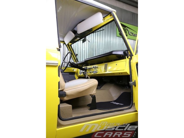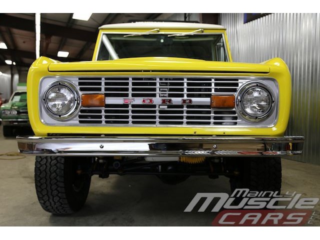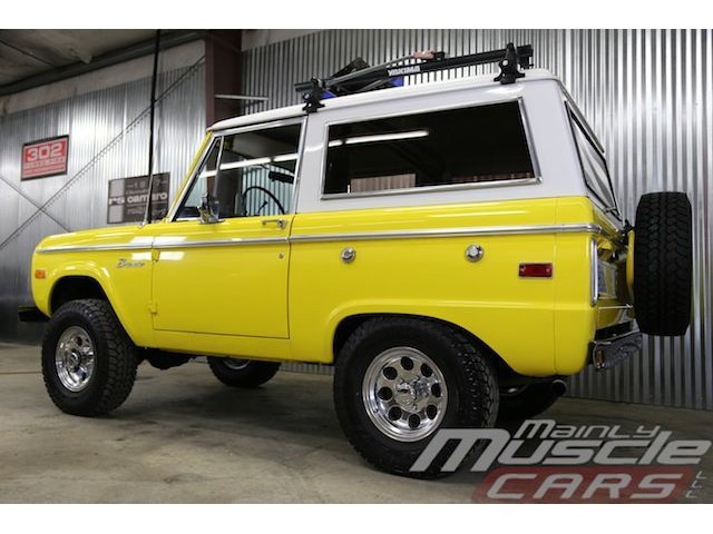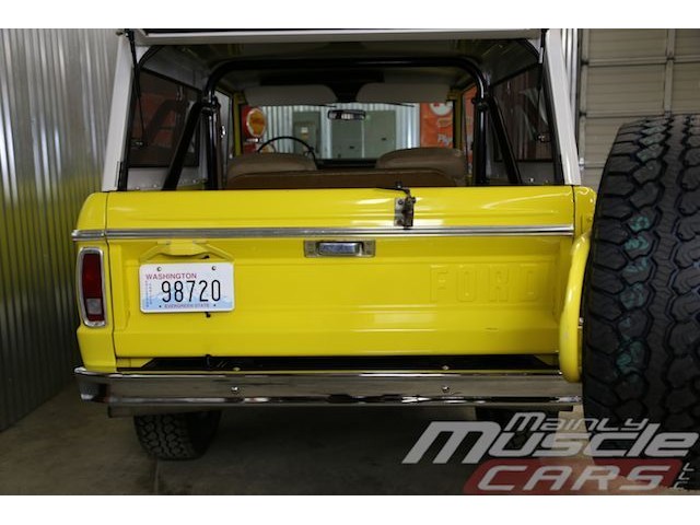 This is a truly rare Bronco. It has remained un-cut and original with only the addition of some tasteful upgrades. This is of course a high trim model with the original chrome side moldings, grill trim and window moldings still in place. It is wearing a nice repaint of the original Chrome Yellow with the Wimbledon White top. There are several touch ups from rock chips and a small ding on the hood.