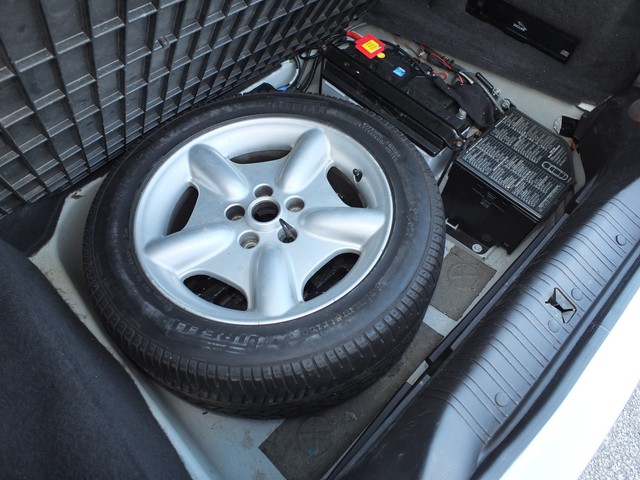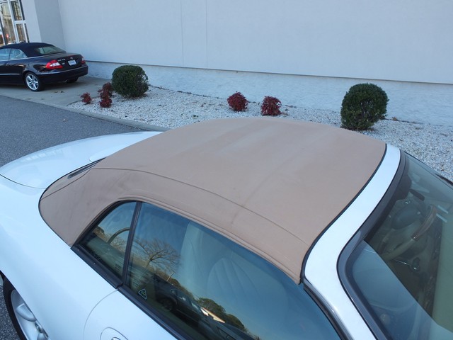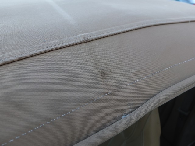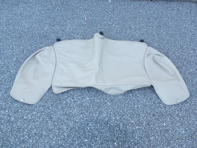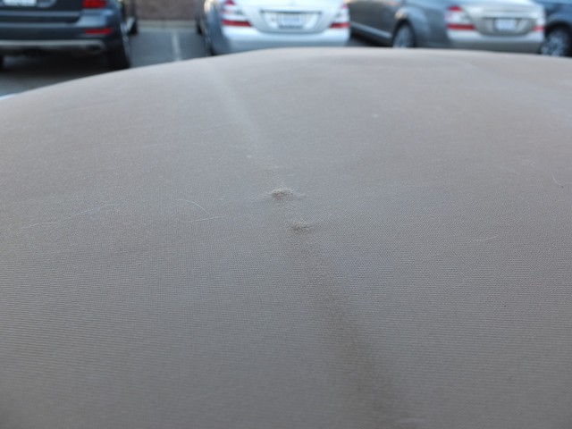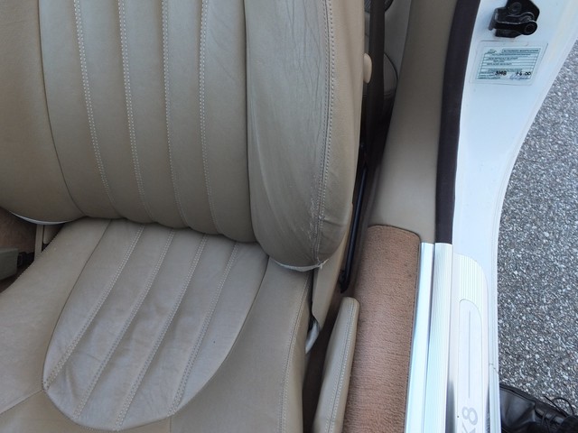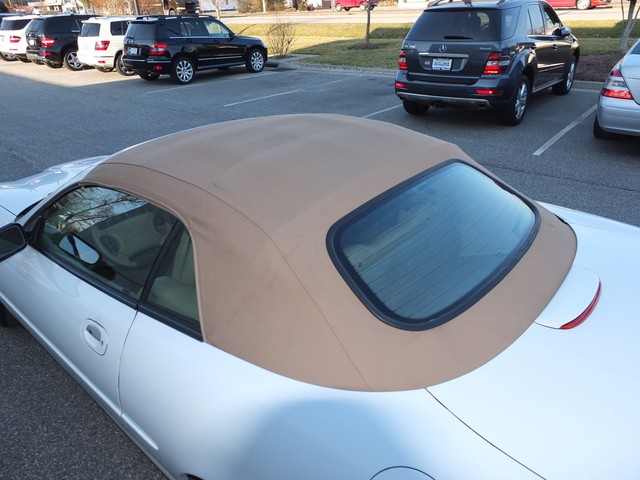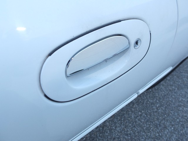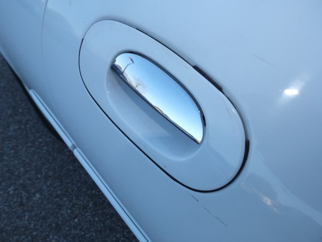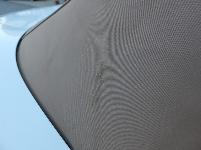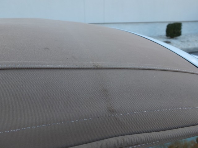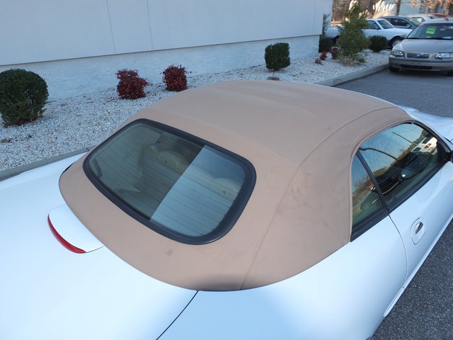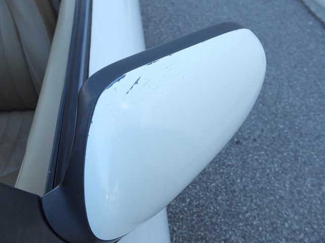 THE BODY IS STRAIGHT AND FREE OF ANY RUST.  THE WHITE PAINT LOOKS GOOD ALL OVER.  UPON CLOSER INSPECTION YOU MAY NOTICE SOME CLEAR COAT STRESS LINES IN A FEW SPOTS.  THERE IS SOME CLEAR COAT PEEL ON THE TOP OF THE LEFT-SIDE MIRROR, ON THE WINDSHIELD'S TOP CROSSBAR AND ON THE 3RD BRAKE LIGHT COVER.  THERE ARE ALSO A FEW TINY PAINT CHIPS HERE AND THERE.  OVERALL, THE PAINT IS GLOSSY AND LOOKS GOOD THOUGH.  THE DOOR HANDLES ARE MISSING PIECES OF THE PLASTIC GROMMET THAT SURROUNDS THEM (SEE PICS BELOW).  THE ALLOY WHEELS LOOK GOOD, BUT HAVE SOME STAINS FROM PREVIOUSLY APPLIED CLEANING SOLUTION.  THE TIRES HAVE ABOUT 50% (FRONT) TO 80% (REAR) TREAD REMAINING.  THE CONVERTIBLE SOFT TOP LOOKS GOOD, BUT DOES HAVE A FEW WORN SPOTS IN THE CANVAS.  HOWEVER, THERE ARE NO LEAKS IN THE TOP.  OVERALL, THE EXTERIOR LOOKS GOOD.