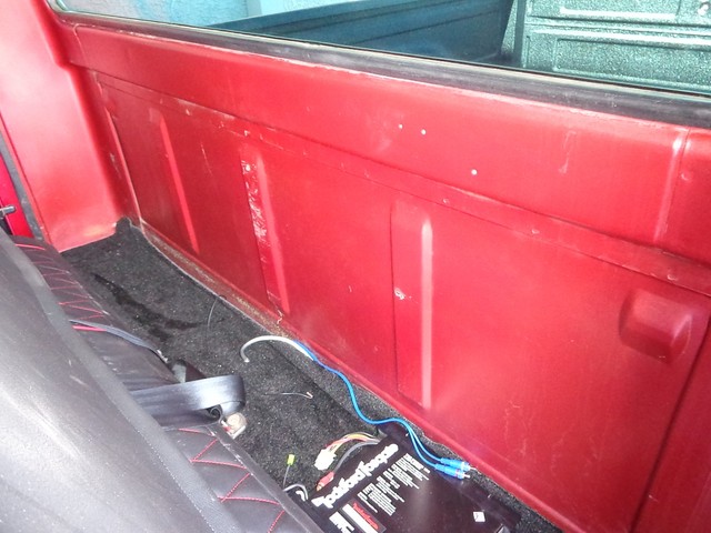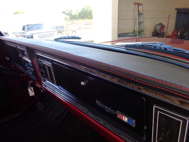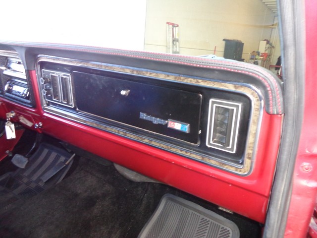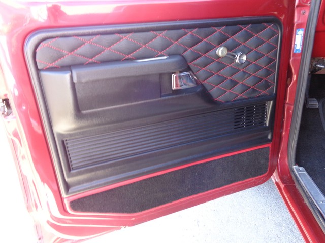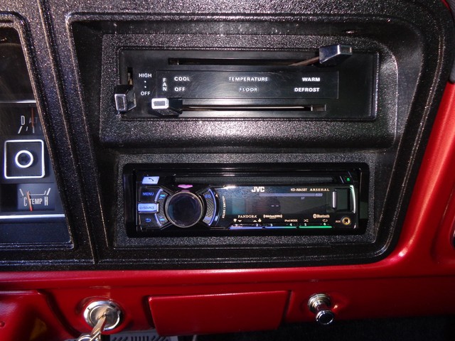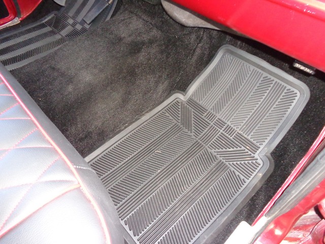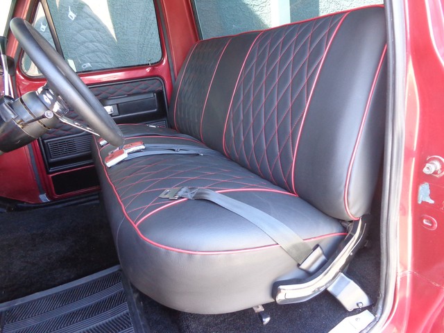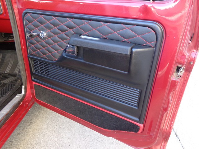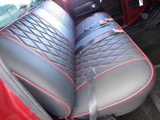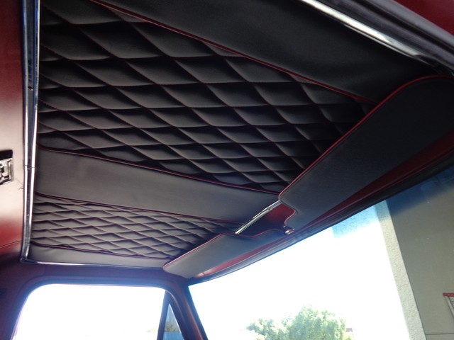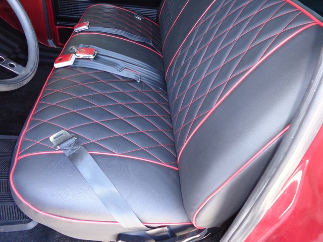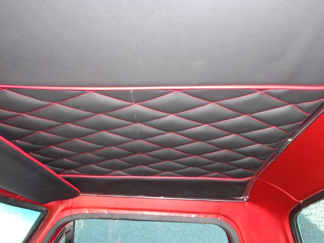 The interior was just restored in a custom black vinyl with red stitching and piping.  It is very good quality custom work.  It has a gorgeous diamond pattern, French seams on the dash and a matching headliner.  It has new reproduction door panels and new black carpets. A custom JVC CD stereo with new speakers was also installed.