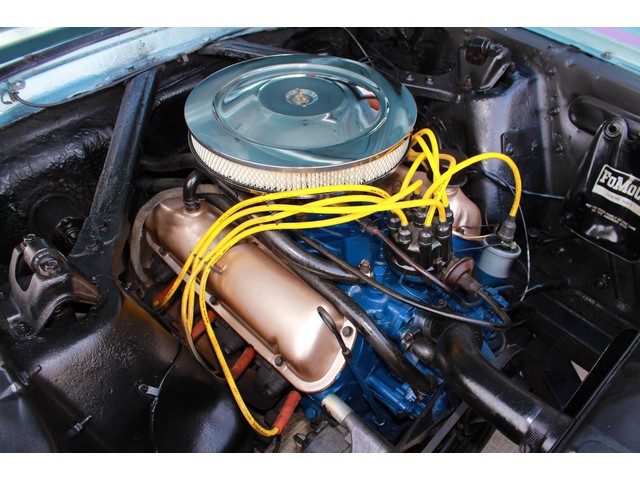 Finally we will take a look at the driveline of the Ford. Under the hood it looks just like it would have in 1965 with the inner fenders being black. The engine is a 289 V8 that is mated to a 4 Speed Trans and an 8” Rear End. Everything look stock with painted intake and valve covers. The engine is a fresh build that was done at the same time of the restoration. When you look under it everything is solid with good floors and frame rails. The brakes were redone with new Wheel Cylinders and shoes.