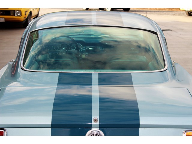 Next, we will take a look at the interior of the Fastback. The interior is done in blue and provides a great complement to the exterior scheme. It has the correct bucket seats up front and the fold down seat in the rear. The seat covers, carpet, door panels and head line is all new. When you look at the dash it’s all stock with only an upgrade to the radio. This ’65 even retains the factory seat belts.