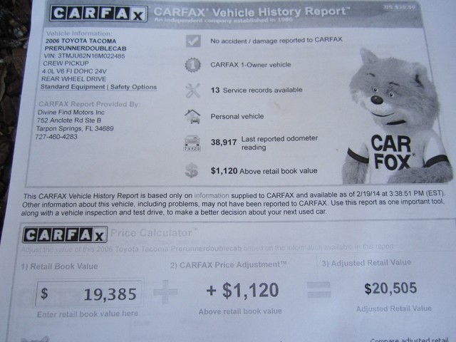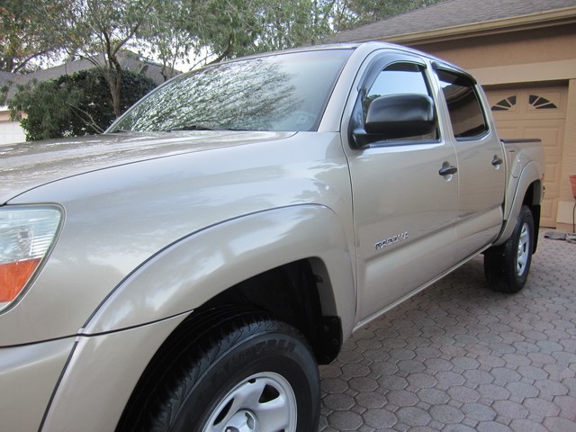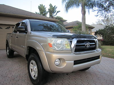 ***************PLEASE WATCH THE VIDEO AT THE END OF THIS DESCRIPTION***************ABSOLUTELY GORGEOUS 2006 TOYOTA TACOMA PRERUNNER DOUBLE CAB SR5 4X2 V-6 AUTOMACTIC TRANSMISSION, ONE ELDERLY FL OWNER, ALWAYS GARAGED SINCE BOUGHT BRAND NEW...CLEAN CARFAX, NEVER IN AN ACCIDENT, ALL ORIGINAL, NEVER PAINTED ANYWHERE, NEVER HAS BEEN SMOKED IN OR EVEN EATEN IN, SERVICE RECORDS, BOOKS AND MANUALS, AND ALL KEYS (3) AND KEY FOBS. THIS DOUBLE CAB PRERUNNER LOOKS FANTASTIC INSIDE AND OUT, AND IT IS IN EXCELLENT CONDITION AND IT IS JUST LIKE "BRAND NEW"... IT IS A GORGEOUS COLOR COMBINATION, AND THE FACTORY PAINT LOOKS AND SHINES LIKE NEW. THE INTERIOR IS ALSO LIKE NEW, ALL THE CARPET LOOKS BRAND NEW, AND THE SEATS FRONT AND BACK, AND THE DASH, AND DOOR PANELS, I TOOK SOME VERY CLOSE UP PICTURES SO YOU CAN SEE HOW CLEAN IT IS. THERE IS NOT A MARK ON ANYTHING. I EVEN TOOK A PICTURE OF THE UNDERNEATH OF THIS TRUCK, IT HAS NEVER BEEN IN THE WOODS, MUD, SALT, IT REALLY IS IN IMMACULATE CONDITION, IT HASN'T EVEN BEEN DRIVEN ON HILLS OR CURVES, NEVER OVER A "POT-HOLE" IT HAS BEEN BABIED SINCE NEW. THE SPARE TIRE HAS NEVER BEEN ON THE GROUND. THIS WAS OWNED BY AN ELDERLY GENTLEMAN, THAT DROVE IT LESS THAN 5K MILES A YEAR NO WORK BOOTS IN THIS TRUCK. THE CIGARETTE LIGHTER NEVER HAS BEEN USED. IT ALSO HAS THE "SR5" PACKAGE TILT, CRUISE, POWER WINDOWS, LOCKS, AND DOORS, REMOTE KEYLESS ENTRY, CD, SLIDING REAR WINDOW, BEDLINER, FACTORY TIE DOWNS, MUDFLAPS, FENDER FLARES, $799 TOYOTA GUARD PROTECTION ON THE INTERIOR, EXTERIOR PAINT, AND UNDERNEATH, AND VIN NUMBER ETCHING ON ALL THE WINDOWS... IT HAS NEVER EVEN HAD ANYTHING IN THE BED OF IT OR NEVER HAS TOWED ANYTHING. THIS BEAUTIFUL TACOMA RUNS AND RIDES AND HANDLES JUST LIKE IT DID NEW, EVERYTHING WORKS FANTASTIC, ALSO COMES WITH VERY NICE FACTORY TOYOTA ALL WEATHER FLOOR MATS PLUS THE FACTORY CARPETED FLOOR MATS, ALL THE BOOKS AND MANUALS THAT CAME WITH IT BRAND NEW. YOU WILL ALSO GET THE (TOYOTA-PRERUNNER SEAT COVERS AND ARM-REST AND HEAD-REST COVERS) THAT HAVE BEEN ON THERE SINCE BRAND NEW, THE SEAT FABRIC HAS NEVER BEEN SAT ON, OR AN ARM ON THE ARM-REST, OR A HEAD AGANST THE FABRIC OF THE HEAD-REST, AND THE REST OF THE INTERIOR OF THIS TRUCK IS LIKE NEW, IT LOOKS FANTASTIC!!!! I AM GOING TO SELL IT TO THE HIGHEST BIDDER AT THE END OF THE AUCTION, AFTER THE RESERVE IS MET...UNLESS IT IS SOLD BEFORE THEN. SOMEONE IS GOING TO GET THIS BEAUTIFUL WELL KEPT "LIKE-NEW" TACOMA PRERUNNER WITH HARDLY ANY MILES ON IT AT ALL, AND IT MIGHT AS WELL BE YOU, YOU DESERVE IT...IF YOU HAVE ANY QUESTIONS PLEASE CALL ME...JACK 727-460-4283 OR CAROL 727-798-7161 OR EMAIL US.  I DO HAVE THIS TRUCK FOR SALE LOCALLY AS WELL. THANK YOU AND GOD BLESS YOU AND HAVE A GREAT DAY...THIS IS TRULY A (DIVINE FIND) AND YOU WILL LOVE IT:) ***********IT HAS JUST HAD A "MAINTENANCE INSPECTION COMPLETED" AND SERVICE DONE AT (COURTESY TOYOTA OF WINTER PARK FL) AND IT IS READY TO GO AND TO BE ENJOYED:)