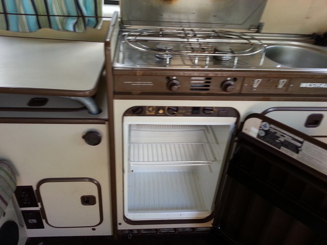 She is equipped with all of the original fixins, a stove, sink, fridge, folding table, pull out bed, and lots and lots of storage. There are external hook ups for water and electricity. The original cloth interior is in good condition.