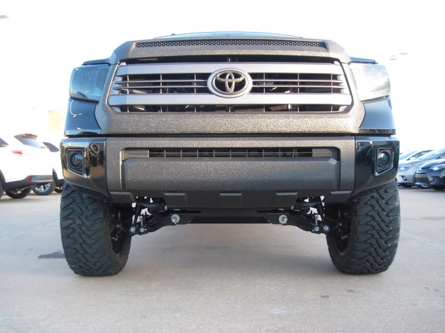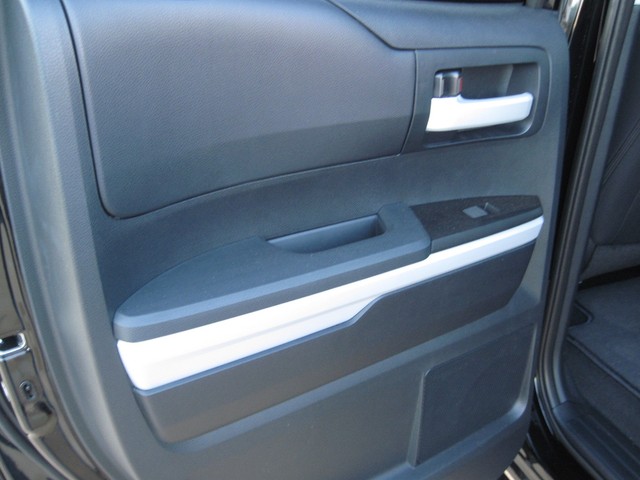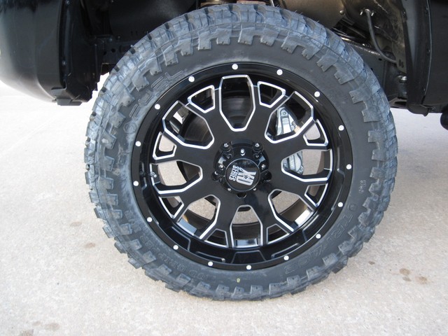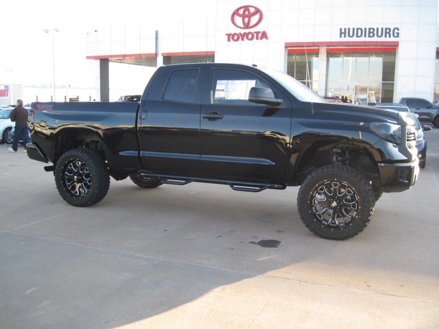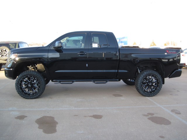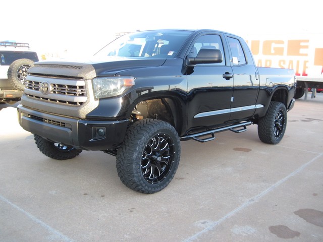 Blacked out all new '14 Tundra Dbl Cab 5.7 in the SR5 package. This truck has a 6" rough country lift, 22' XD wheels, Fuel mud gripper tires(35s). Tinted windows, tails, fog lamps, and front headlights. We installed hid headlamps in the headlights due to the darker tint. These are not covers. We do these custom. We put the running boards on than powder coated the front/rear bumper ends to match the factory paint. More durable and you can't tell a difference in color! We spray lined the front mid bumper, emblem, and upper grill surround. We capped it off by removing all Toyota badging.