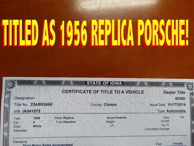 Very nice and well preserved 1956 Porsche 356 Replica Roadster! Vehicle does show patina here or there which does add to the authenticity of such a vehicle. Side glass is included, but has never been properly fitted to vehicle. Some glue slightly visible under emblems and moldings. Car Runs – Drives – and Performs very well. Car comes recently serviced and safety inspected by the state of Iowa.  Please call or email with specific condition questions. Personal and Third party inspections are welcomed and encouraged. Please perform all inspections before bidding and buying as all sales are final.