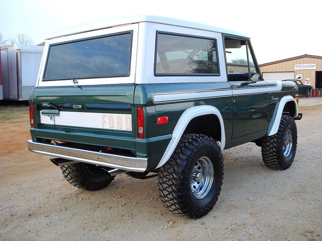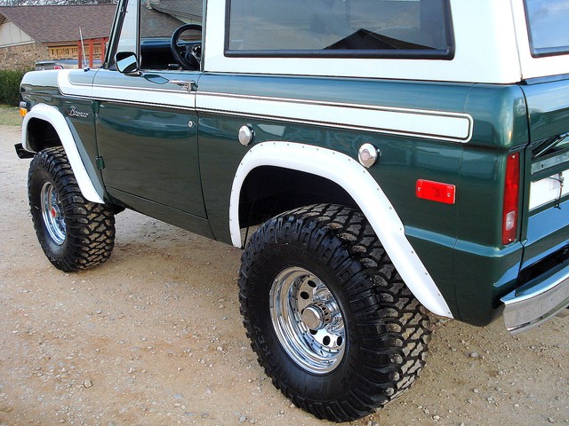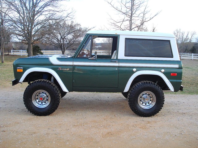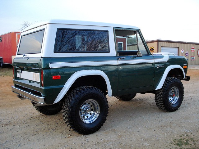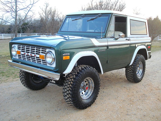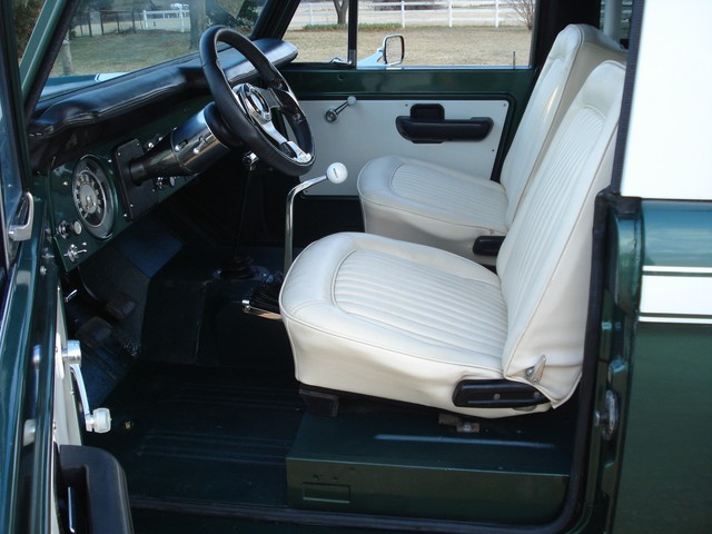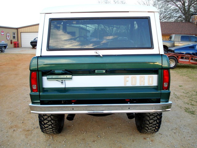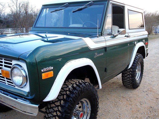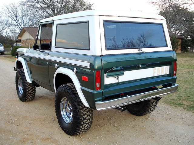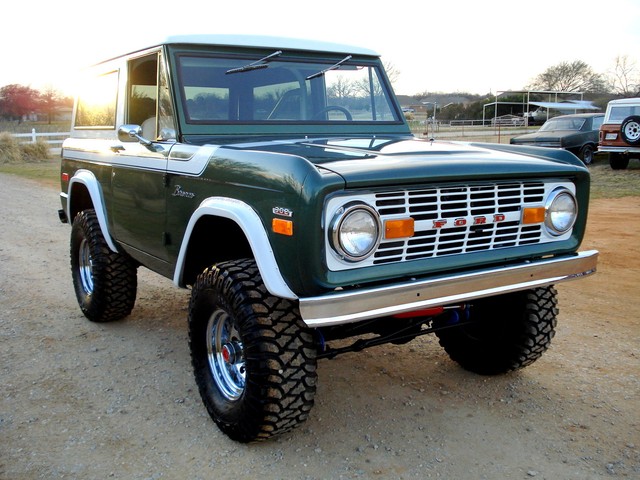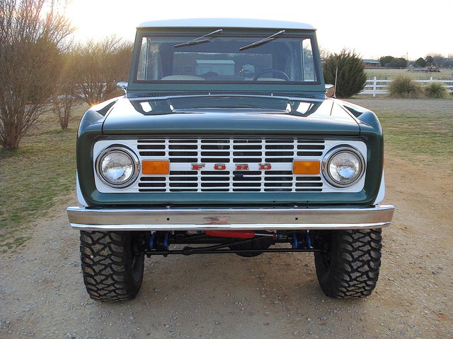 NO RESERVE.  1970 Custom Ford Bronco Restored and Lifted.  This Bronco was purchased by our shop; part way through a restoration by her previous owner.  We completed the restoration and she looks great.  The engine, transmission and power steering were completed when we got the bronco, and we finished up the rest.  We removed the front fenders, grill, hood, doors, and top; repaired any rust that we found with correct replacement metal (we do NOT bondo hide rust).  We painted the top and stripes in bright white, did the exterior in Ford Dark Moss Green and used a colored rock-chip spray on the interior, fender flairs and roll bar to add to her custom look, those areas are all textured.  This Bronco was painted with the glass, doors, fenders, top, hood and gaskets removed.  This was a REAL paint job, not a claimed one.  All glass was installed painted with using new rubber gaskets, doors installed with new hinge pins and fenders with new mounting hardware.  Door latches, window felts and wing windows were removed before paint and new gasket and felt kits installed after paint.  She has a Polished Tilt Aftermarket Steering Column with Power Steering.  This bronco has a floor mounted 3-Speed manual transmission with a Hurst shifter, chrome handle and shift ball.  The top glass and gaskets were removed to paint the top and when installed, new gaskets and the glass was tinted prior to install. We replaced the factory black rubber body mounts with the Red Body Poly Mounts with new hardware.  The 4" Pro-Comp Suspension lift included new blue Poly bushings, Pro-Comp shocks and New Taller Springs. She drives like a typical lifted Bronco, running 35" Mickey Thompson Baja Tires and a 4" Lift.  Please call Ron (me) at 682-333-7433 with any questions.  I have included some before paint pictures at the bottom.  This is not an average priced claimed restoration Bronco, this was a complete body off build and is selling at A REAL NO RESERVE.  Check out the YouTube Video above the description.