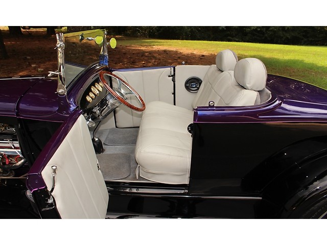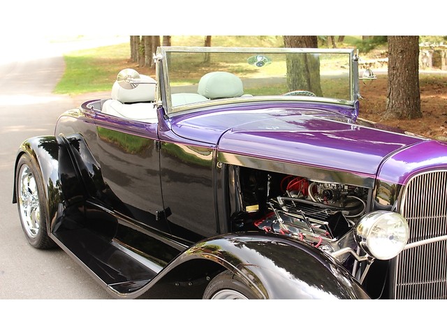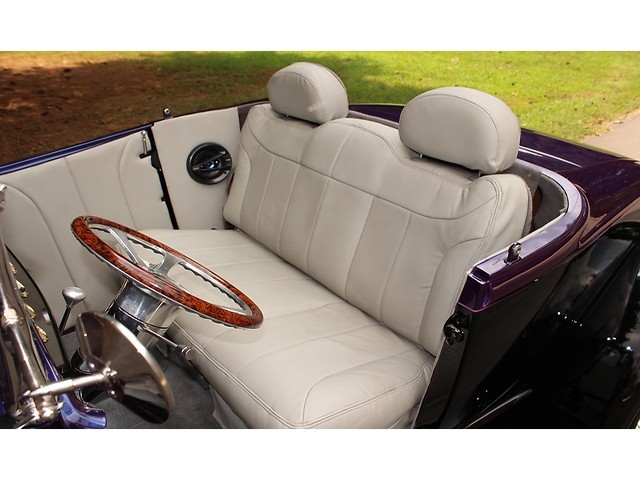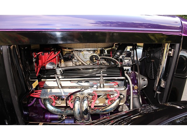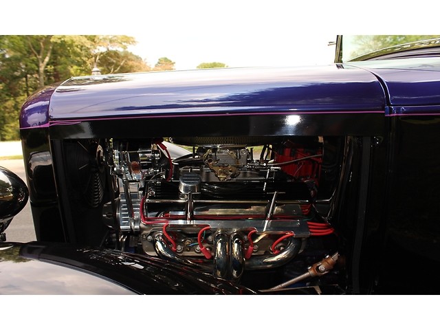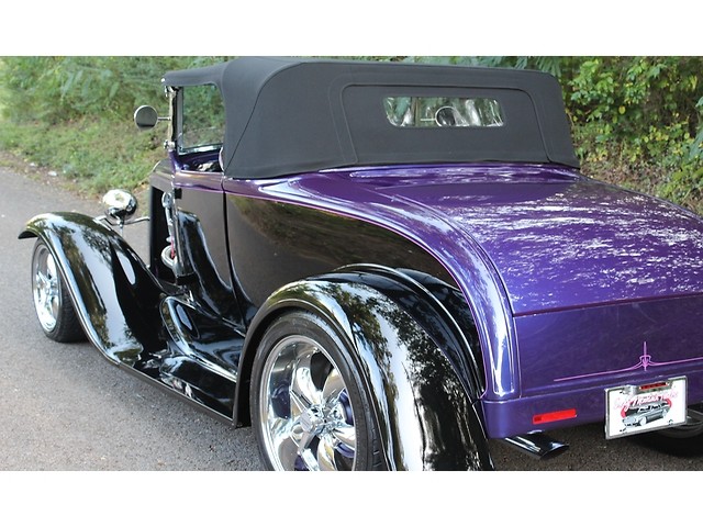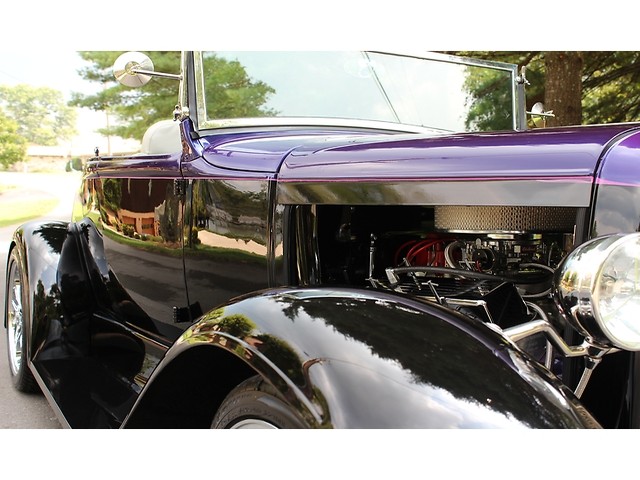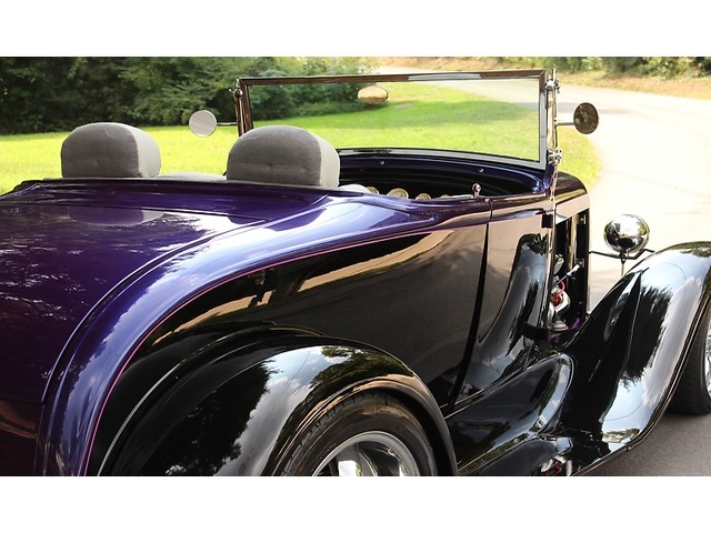 We will start off with the exterior of the Ford. As we said this is a steel car all the way to the fenders and running boards. As for the body the fit and finish of everything is good. It’s covered in the Black and Purple Pearl base coat clear. This car was painted apart and then put together. It has been buffed and polished to ensure a deep rich finish, and is accented by a new canvas top that comes off. Also it has new chrome and stainless as well as new weather stripping. This roadster is setting ona a new set of American Racing Wheels with the 3 Bar Spinners.