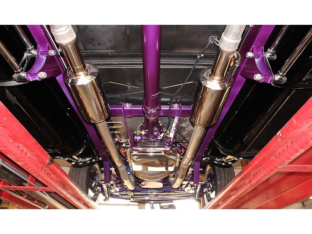 Finally, we will take a look at the driveline of the Ford. It has a 350 V8 that is mated to a 350 Turbo Trans and an 8” Ford Rear End. The engine is dressed with Aluminum head, Aluminum Intake, Edelbrock Carb, and Polished Aluminum Valve covers. They used billet pulleys and brackets along with a chrome Alternator. For the exhaust it has Chrome Short Headers along with stainless mufflers. The brakes are disc up front and drum in the rear. Also it has coil over shocks in the rear and up front it has the straight axle with the 4 Link. The bottom is all painted to match the body colors with an aftermarket frame.