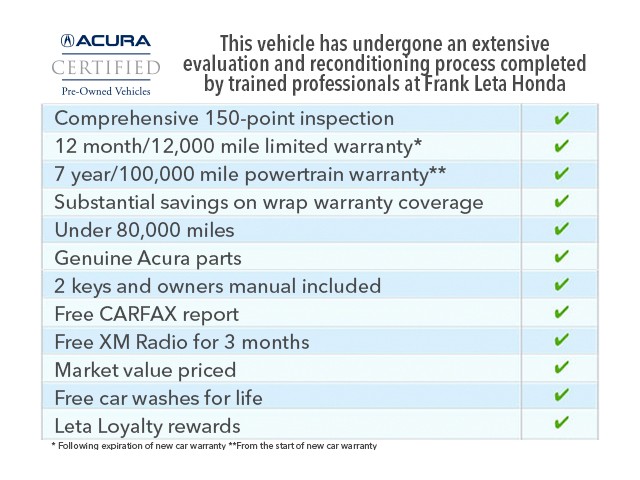 At Frank Leta Acura, we know that the appearance of a vehicle is important but does not mean that it is reliable.  There could be hidden mechanical issues, body or frame damage, a concerning ownership history, or other such factors that you should know about before purchasing.  We take away nearly all of these uncertainties by selecting good vehicles, inspecting them for your peace of mind, providing a full vehicle history report, and pricing them fairly from the start.  No matter which class of pre-owned vehicle you choose, you can't beat a Leta!