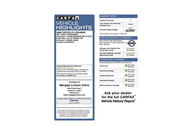 CarFax report shows no serious accidents, no odometer rollback, no flood damage, not a lemon.