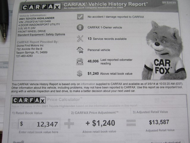 ****************PLEASE WATCH THE VIDEO AT THE END OF THIS DESCRIPTION***********CONGRATULATIONS FOR EVEN FINDING THIS AMAZING TOYOTA HIGHLANDER, LISTEN I AM JUST GOING TO GO AHEAD AND TELL YOU, YOU SHOULD GO AHEAD AND GET IT BEFORE SOMEONE ELSE DOES, IT IS THAT NICE AND FOR THE MONEY THAT I AM GOING TO SELL IT FOR YOU CAN'T FIND ONE LIKE IT ANYWHERE, IT IS LIKE BRAND NEW**********ABSOLUTELY GORGEOUS TOYOTA HIGHLANDER 2WD THAT IS IN JUST PRISTINE CONDITION. WHAT A BEAUTIFUL VEHICLE AND IT HAS BEEN SO VERY WELL TAKEN CARE OF SINCE BOUGHT BRAND NEW, IT REALLY LOOKS LIKE NO ONE EVER SAT IN IT BUT THE DRIVER. THIS BEAUTIFUL HIGHLANDER HAS ALWAYS BEEN GARAGED AND HAS HAD EVERY SCHEDULED MAINTENANCE THAT TOYOTA CALLS FOR, SINCE DAY ONE, AND IT HAS JUST BEEN SERVICED, AND HAS A BRAND NEW 60 MONTH "TOYOTA BATTERY" OIL CHANGE, AND NEW BRAKES, NEW DRIVE BELTS, FOLKS THIS TOYOTA IS LIKE NEW. CLEAN CARFAX WHICH YOU WILL GET WHEN YOU BUY IT, NEVER IN AN ACCIDENT, NEVER SMOKED IN, I DON'T EVEN THINK IT HAS BEEN EATEN IN, OR CURSED IN, I MEAN IT IS IMMACULATE ON THE INSIDE OF IT AND OUT. NOT HARDLY A MARK ON IT ANYWHERE. (PLEASE TAKE A LOOK AT ALL THE PICTURES) THE INTERIOR IS IN EXCELLENT CONDITION IT IS REALLY AMAZING HOW NICE IT IS, IT LOOKS LIKE IT HAS 4K MILES ON IT, IT EVEN STILL SMEELS NEW...AND THE EXTERIOR IS IN EXCELLENT CONDITION AS WELL, IT IS PERFECT, AND IT IS GORGEOUS, THE BEST COLOR COMBINATION THAT YOU CAN GET, YOU WILL JUST LOVE THIS HIGHLANDER, IT LOOKS AWESOME, EVEN THE UNDERNEATH OF IT IS LIKE NEW. THIS BEAUTIFUL HIGHLANDER RUNS AND RIDES AND HANDLES LIKE IT DID BRAND NEW. THESE ARE THE BEST RIDING SUV'S THAT TOYOTA MAKES, THEY ARE AMAZING HOW NICE THEY RIDE AND HOW QUIET THEY ARE, EVERYTHING WORKS PERFECT LIKE TOYOTA'S DO, AND THIS WILL BE ONE OF THE BEST VEHICLES THAT YOU HAVE EVER OWNED...YOU COULDN'T HAVE FOUND ONE THAT HAS BEEN TAKEN CARE OF ANY BETTER!!! ***********PLEASE TAKE A LOOK AT THE VIDEO AT THE END OF THE DESCRIPTION, AND THE PICTURES***********IF YOU HAVE ANY QUESTIONS PLEASE GIVE ME A CALL 727-460-4283 OR 727-798-7161 OR EMAIL US, WE WOULD BE HAPPY TO TELL YOU WHAT THE LOW RESERVE IS AND HOW MUCH YOU CAN GO AHEAD AND BUY IT NOW FOR...HEY I DON'T WANT TO SOUND LIKE A SALESMAN HERE BUT YOU REALLY DON'T WANT THIS ONE TO GO TO SOMEONE ELSE, THE NEW OWNER WILL BE VERY VERY HAPPY WITH THIS GORGEOUS TOYOTA HIGHLANDER "LIMITED"...THANK YOU GOD BLESS YOU AND HAVE A BLESSED DAY:)