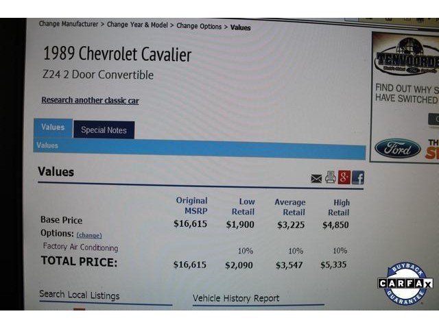 ******RARE FIND!******CAVALIER Z24 CONVERTIBLE******CAR FAX CERTIFIED NO ACCIDENTS EVER!******HIGH OUTPUT 2.8L V6!******$1,835 UNDER NADA.COM BOOK VALUE******GRANDFATHER OWNED!******THATS RIGHT, THIS 1 IS A CLASSIC!******DONT MISS THIS CHEVY............. Talk about loaded! Unparalleled in the marketplace. Confused about which vehicle to buy? Well look no further than this fully-loaded 1989 Chevrolet Cavalier Z24 Convertible! From the looks of it, I'd say This Cavalier has been garage kept and pampered regularly. If only my wife treated me as nice! Everything power on this Cavaleir works just as it did day 1 including all 4 windows up and down and power Convertible top forward and back! A/C is ice cold! Heat is as hot as a Furnace! Serviced, inspected, fully detailed & is ready for YOU! Call us now to schedule your appointment today and dont forget to ask about our Financing Options! Thanks for looking.