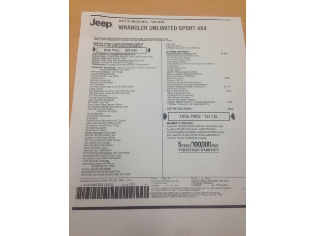 You are bidding on a very clean, one owner 2012 Jeep Wrangler Unlimited Sport with 20,778 miles that has a clean Carfax report.  This vehicle is loaded from the factory and also has an additional $8,900 of upgrades which is listed below in this listing.  The one previous owner took extremely good care of this Jeep and it's now looking for its second owner to enjoy.  This Jeep will make you stop in your tracks and stare, so if you have been looking for a very well maintained and loaded Jeep Wrangler Sport Unlimited this is the perfect one for your needs.  Please call or email today if you would like to end the auction early.
