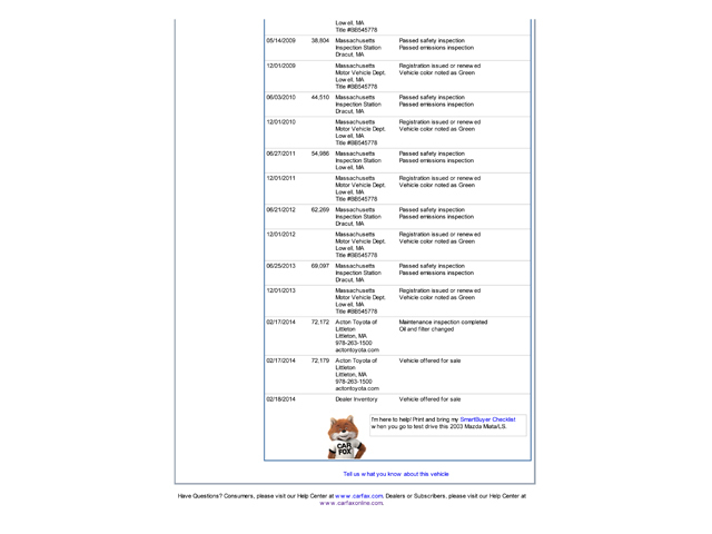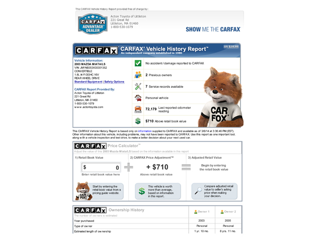 This Mazda was recently traded at our new Toyota Dealership, and Acton Toyota is pleased to offer it for sale on eBay! Prior to us making it available for sale, our master-certified Toyota technicians performed a multi-point inspection along with a used car safety check, at our award winning service department. This Miata passed with ease. The technicians notations reflect minor fluid leaking. A copy of the multi-point inspection is listed with the photographs for your confidence in bidding.