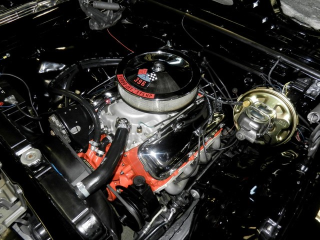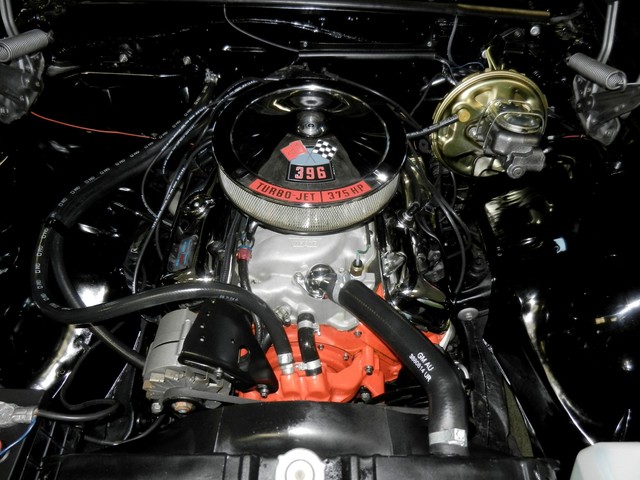 Look at the body on this car ! Completely and beautifully over-restored real deal 138 code SS396 Chevelle, real 396/375hp V-8, Muncie close ratio 4-speed transmission, 3:55 Posi-Traction rear differential, mirror finish Tuxedo black paint, great looking red 6 passenger bench seat interior, factory SS dash with gauges,optional power disc brakes, optional power steering, rally wheels with redline radials, matching red pinstipe, hidden Pioneer sound system w/ M/FM/CD/iPod jack, correct tower clamps, GM hoses, correct radiator ( hidden electric fan ) nicely detailed undercarriage, over-restored engine and trunk compartments,last year for this body style,plenty of receipts,enough said, great car to show or just drive.
