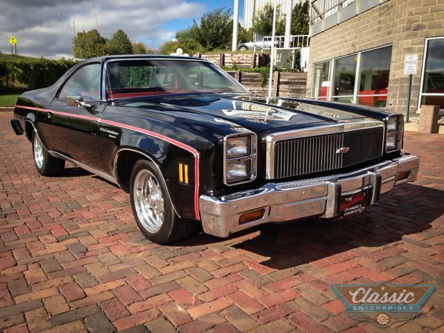 1977 Chevrolet El Camino.  Powered by the proven, dependable, and economical 305 with a smooth Turbohydromatic Column Shift Automatic, Power Steering and Power Disc Brakes, All Season Factory Air Conditioning, Soft Ray Tinted Glass in all Windows, AM-FM Sound System, and Twin Chrome Outside Mirrors with Day/night Inside.  There is the Optional Dual Exhaust System with "quiet" mufflers, along with Weld 5 Spoke Polished Aluminum 16" Wheels, a120 mph Speedometer, Safety Guard Seat Belts, Padded Dash and Sun Visors, the Owner's Book and Sales Literature are included.  This one is finished in Tuxedo Black with Red Accent Trim and Lipstick Red Interior with Center Arm Rest, Carpets. The Legend is this is from the private collection of a 77 year-old lady who loved and enjoyed this fine vehicle! Runs, rides, and drives as nice as it looks. Very, very collectible as it is the last year