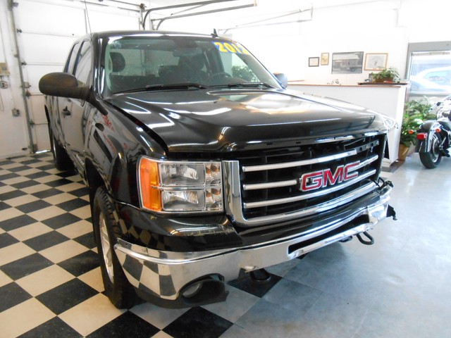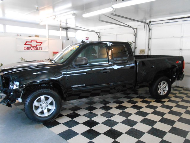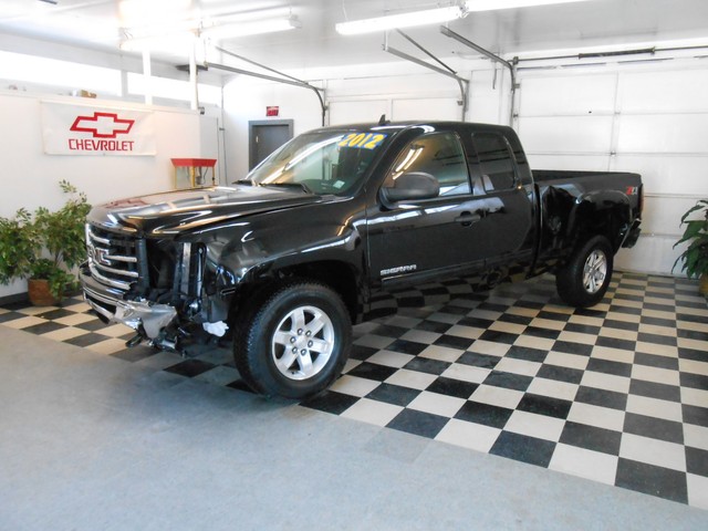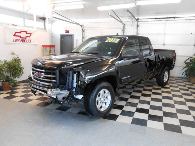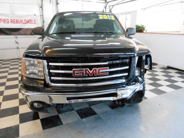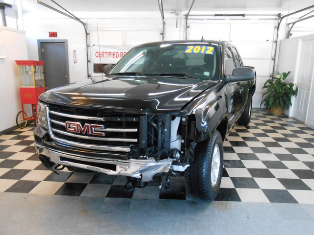 This 2012 GMC Sierra Ext Cab SLE 4x4  has front damage and driver's side damage. This GMC pickup runs and lot drives and has many desirable features including; an powerful 5.3 liter V8 engine, automatic transmission, air conditioning, power windows, power locks, power mirrors, cruise, steering wheel controls, spray-on bedliner,  onstar, and satellite radio w/cd player.  The hood and left fender have been replaced.