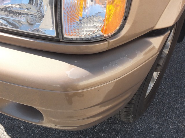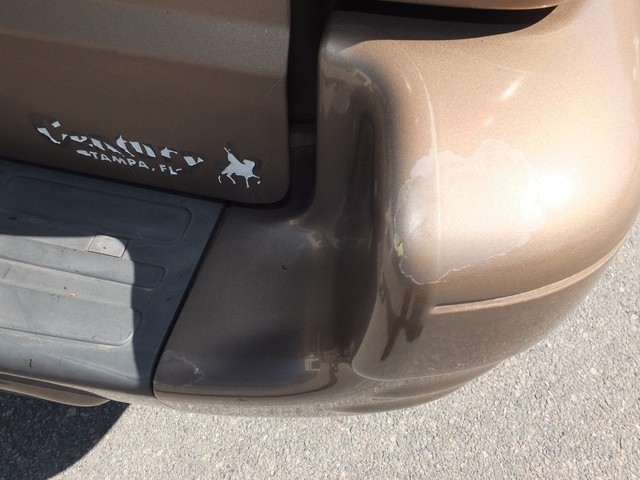 THE BODY IS MOSTLY STRAIGHT AND FREE OF ANY RUST.  THE GOLDEN BROWN (REPAINTED A FEW YEARS AGO) PAINT LOOKS GOOD OVERALL, BUT THERE A FEW SPOTS ON THE BUMPERS WHERE THE PAINT/CLEAR COAT IS FADED AND OR FLAKING (SEE PICS BELOW).  FOR THE MOST PART, THE PAINT IS GLOSSY AND LOOKS GOOD.  THERE ARE SOME MINOR CHIPS AND SCRATCHES HERE AND SOME SMALL DINGS TOO.