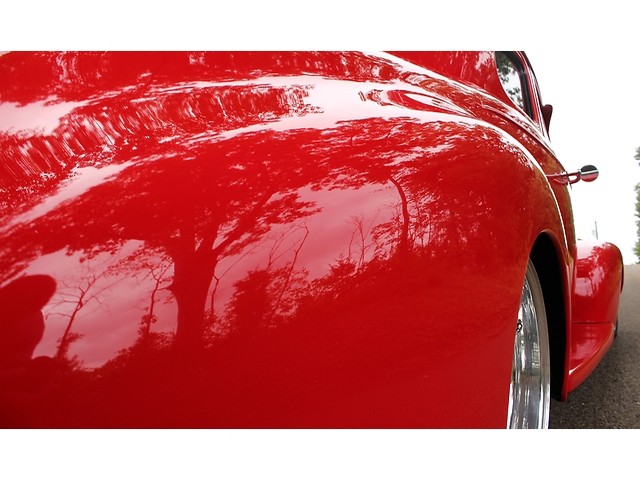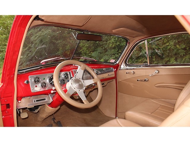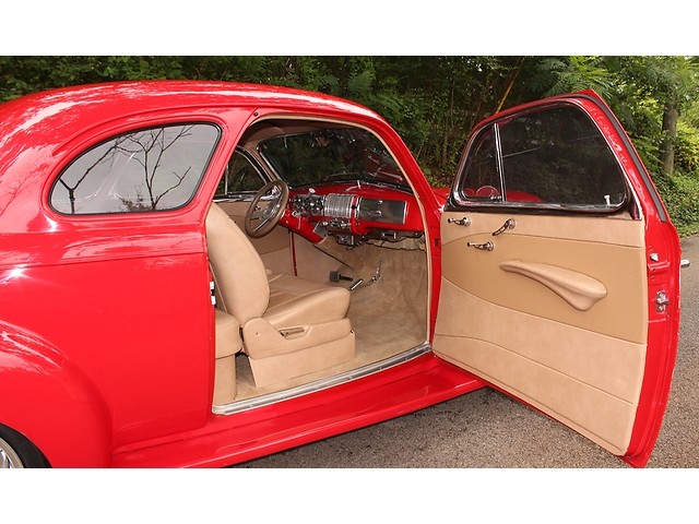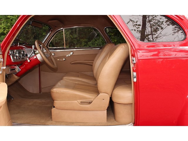 Next, we will take a look at the interior of the ’40. It is all done in Beige Leather that really sets off the exterior scheme. The seats are a set of low back buckets with what looks to be the correct rear seat. The dash is painted in the same Victory Red with a Tilt Wheels and a LeCarra Steering wheel. All the gauges were updated along with a Vintage Radio and Vintage Heat/AC. The trim around the doors, windshield, and back glass is chrome. This ride has been fitted with seat belts. The window knobs and pedals are Locar Aluminum. They even took the time to be sure that the horn and dome light work as they should.