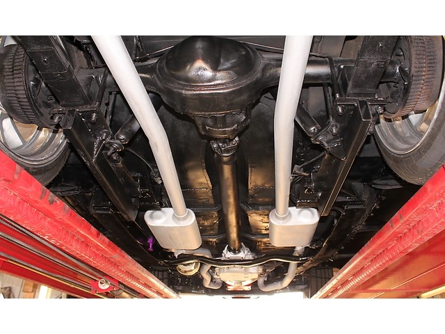 Finally, we will take a look at the heartbeat of the Chevy. Under the hood all the fire wall and inner fenders are painted to match the exterior. The engine is a BB V8 that is mated to a 400 Turbo Trans and a 9” Ford Rear End. It has been dressed with a Weiand Polished Intake and Polished Aluminum Valve Covers. Also it has billet pulleys and brackets, a chrome alternator, and a Polished Aluminum AC Compressor. The ignition was changed to MSD and an Electric Cooling fan was added. It comes with Coated Headers and Flows for the exhaust. When you look at the bottom up front it appears to have what looks like a Fat Boy Front End with Tubular Upper A Arm, Rack and Pinion Power Steering, and Power Front Disc Brakes. It has very good floor and the frame appears good and solid