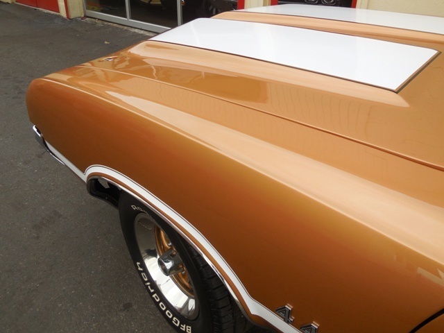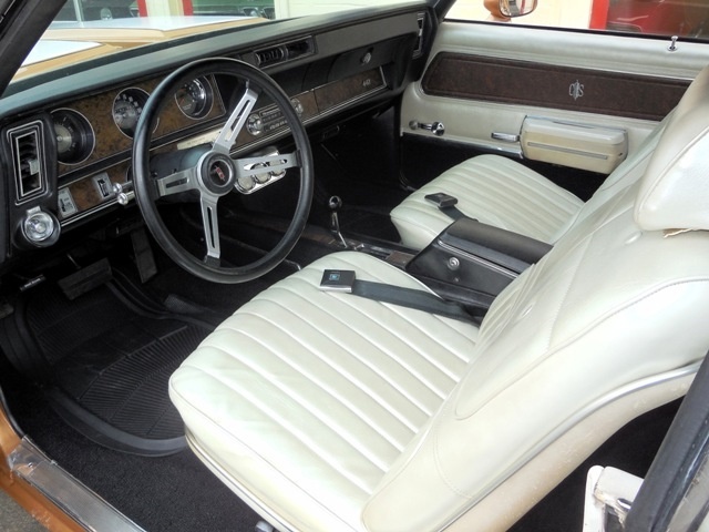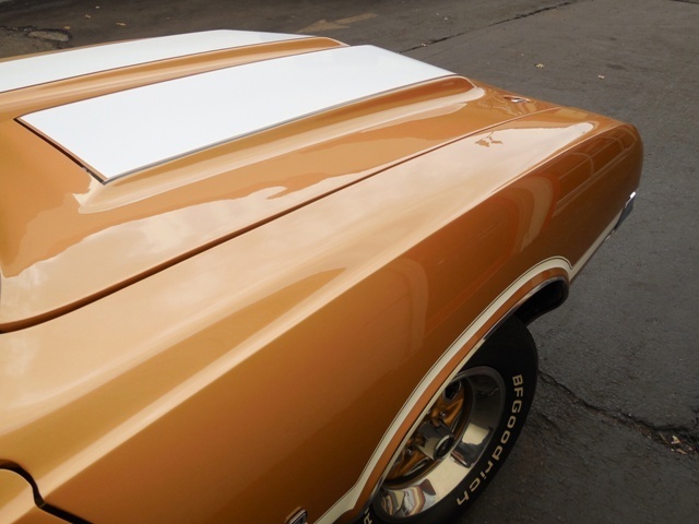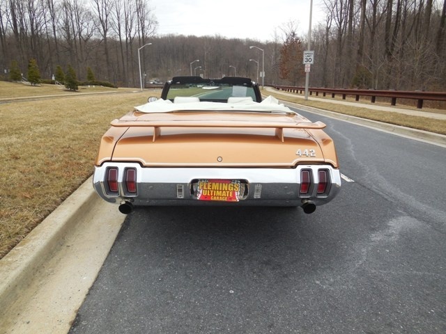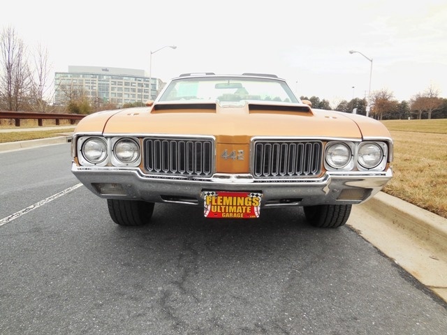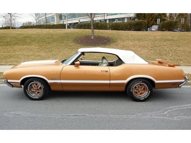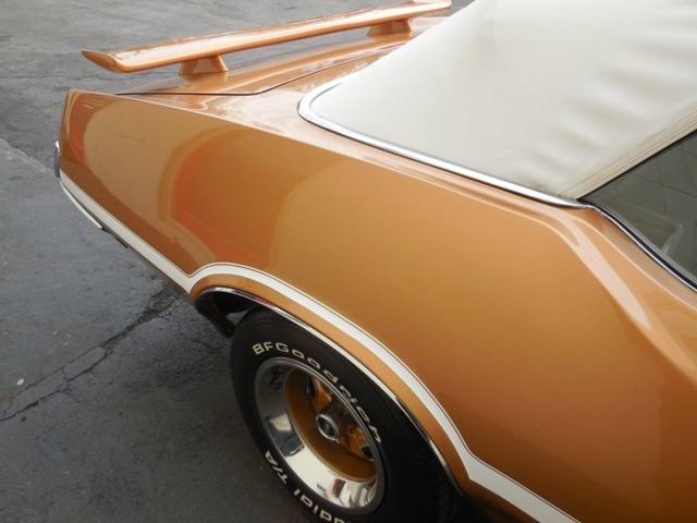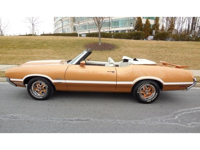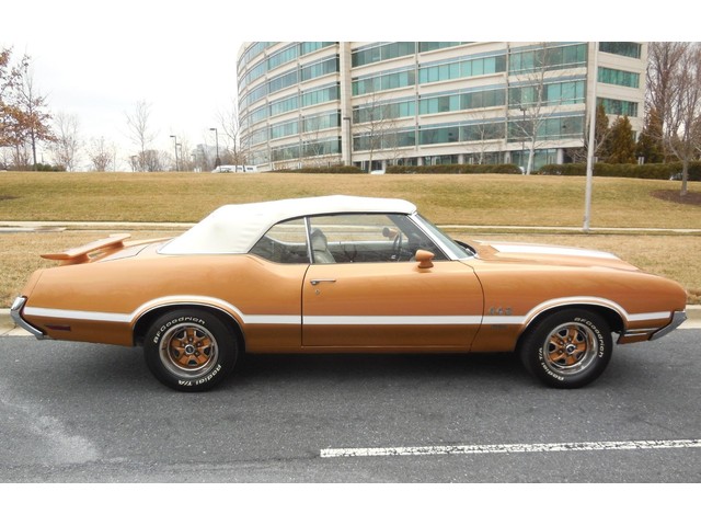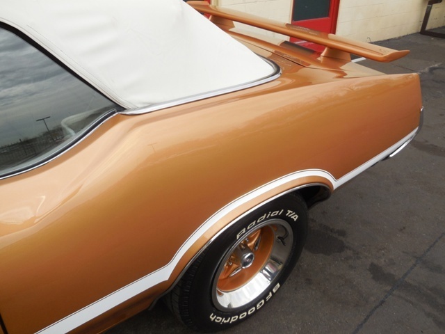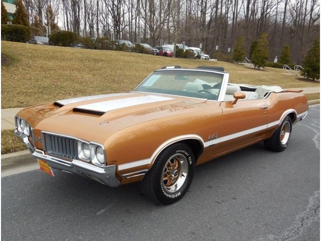 Considered the best riding Muscle Car ever! Oldsmobile Rocket 455cid Big Block V8@390hp, factory HD automatic transmission, factory original HD 12 bolt rear differential w/aluminum W27 cover, mirror finish Galleon Gold paint w/white stripes, white “Strato” bucket seat interior w/factory console & Hurst dual gate “His & Hers” shifter, white power convertible top w/matching boot, OAI Outside Air Induction hood w correct vacuum operated OAI fresh air cleaner, rare ice cold factory air conditioning A/C, sport steering wheel & side mirrors, full gauges w/120mph speedo & 7K tach, great sounding bumper exit dual exhaust w/correct trumpet tips, correct SSI rally wheels w/BFG radial T/A’s, optional  power disc brakes, optional fast ratio power steering, optional rear spoiler. Professionally restored and reproduced.