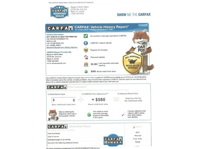2011 A6 PRESTIGE 4.2 QUATTRO AWD CARFAX CERTIFIED ONE FLORIDA OWNER LIKE NEW WTY
