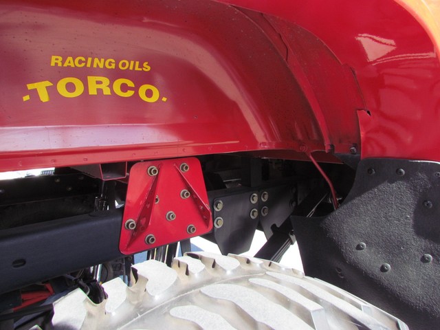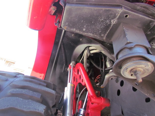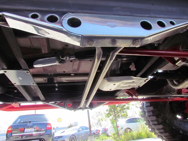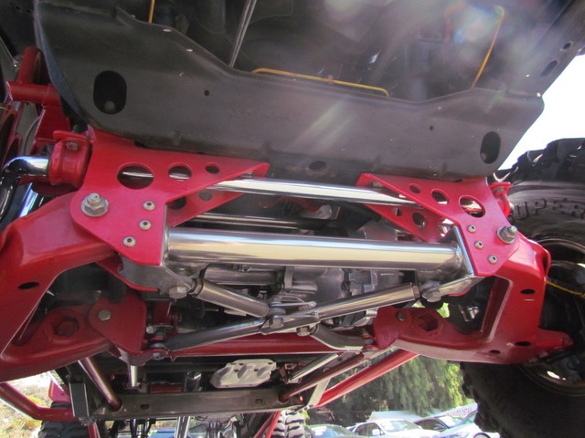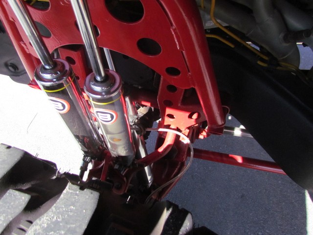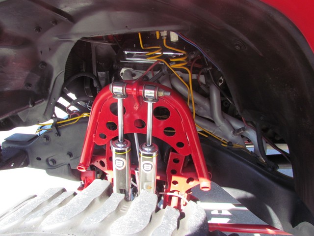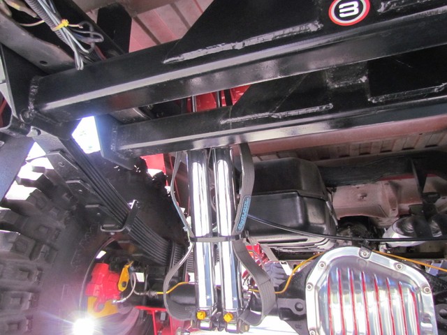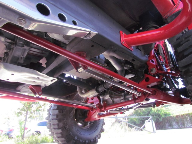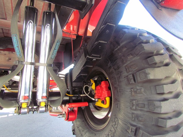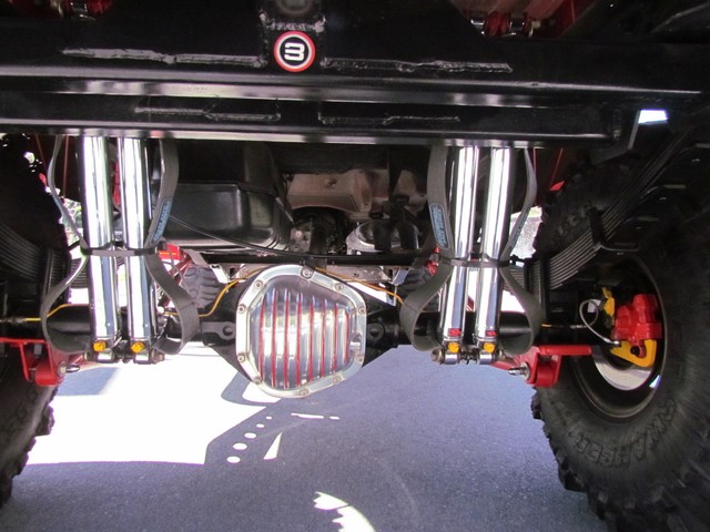 Dick Cepek rear ladder bars custom rear differential with red powder coated sub-frame. Incorporating 4 chrome Super Shocks with limited straps.