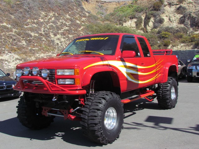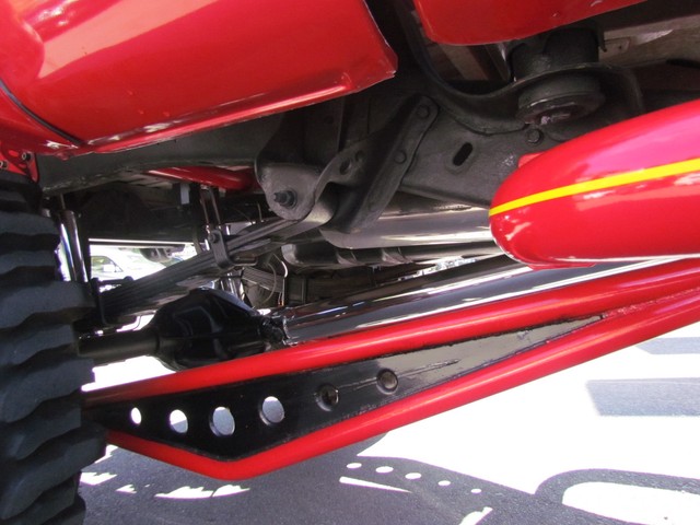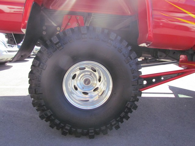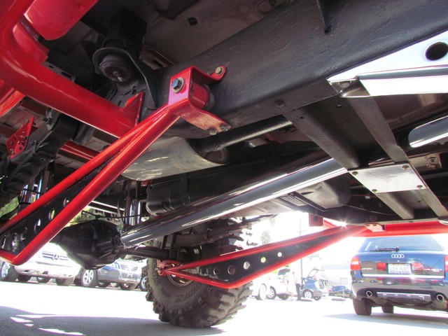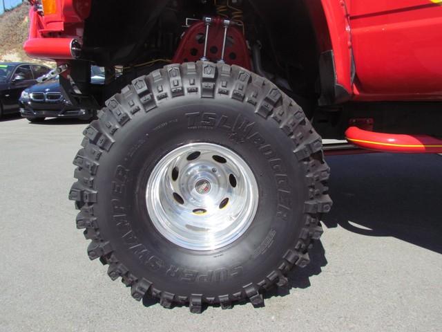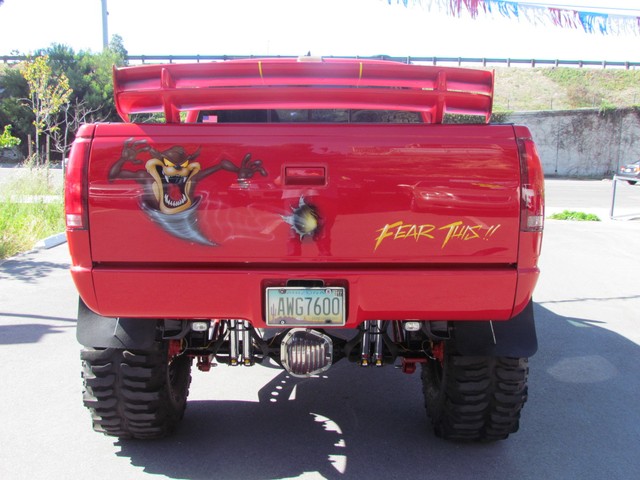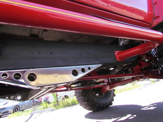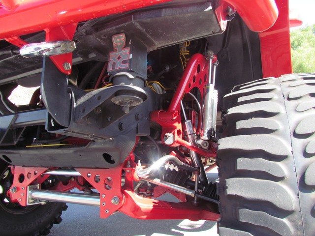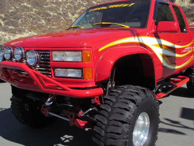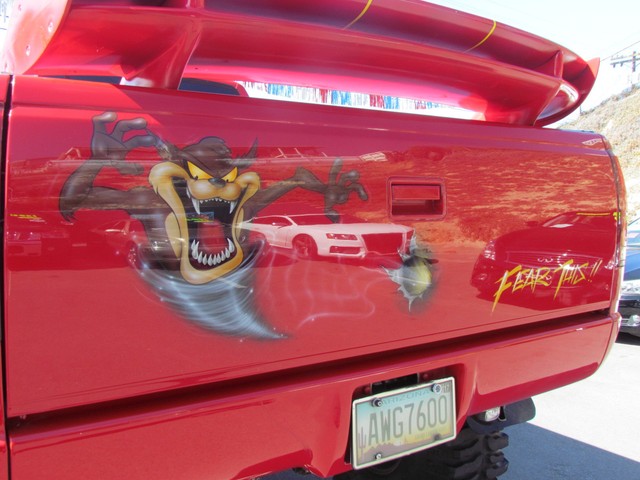 Dick Cepek GMFS Stage 4 front suspension system, in powder coat re with 6 Cepek chrome super shocks, integrated cross member supports, custom Bullet front differential case and custom transfer case with steering wheel stabilizer, 8 foot chrome heavy duty drive line, carbon fiber srid plates, front and side tube Cepek brush Bars with 4 Cepek Lazer lights, House of Colors custom red paint with yellow and white grafixs. And the tailgate with the Taz-mania devil airbrushed by Warner Bros studios in Burbank.