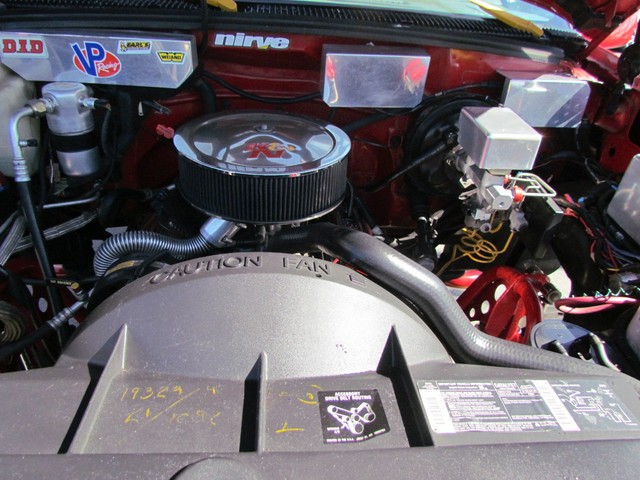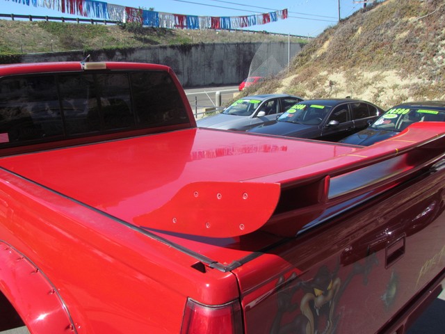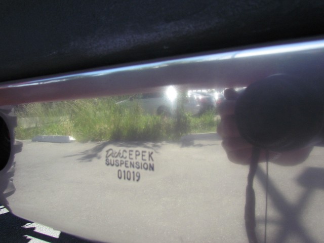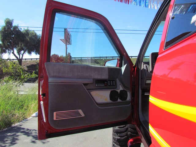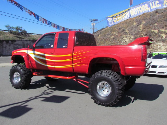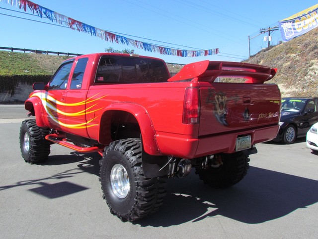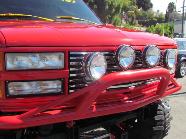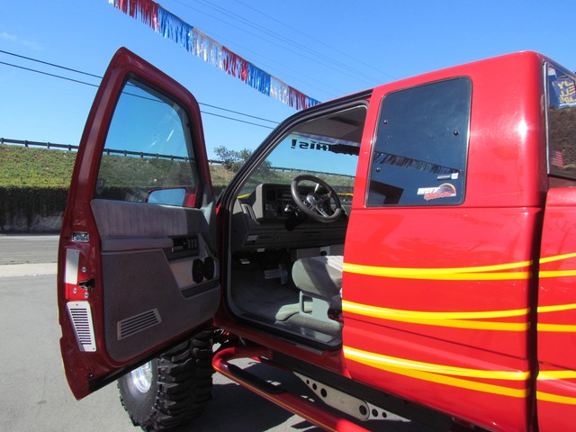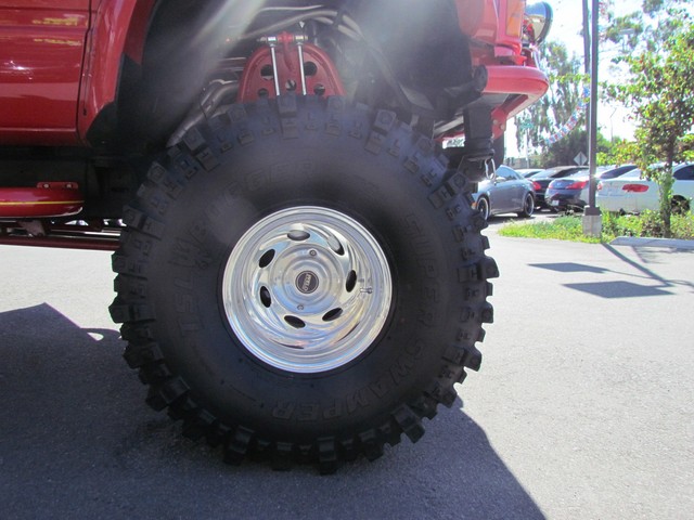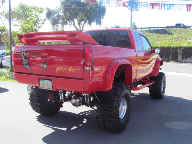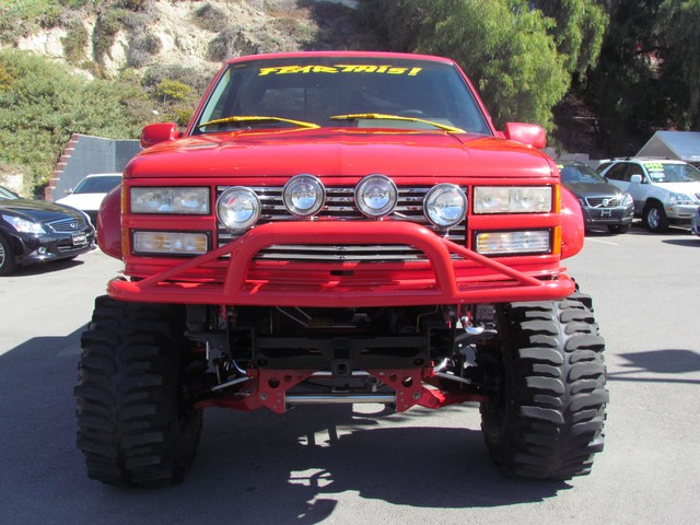 Dick Cepek GMFS Stage 4 front suspension system, in powder coat re with 6 Cepek chrome super shocks, integrated cross member supports, custom Bullet front differential case and custom transfer case with steering wheel stabilizer, 8 foot chrome heavy duty drive line, carbon fiber srid plates, front and side tube Cepek brush Bars with 4 Cepek Lazer lights, House of Colors custom red paint with yellow and white grafixs. And the tailgate with the Taz-mania devil airbrushed by Warner Bros studios in Burbank.