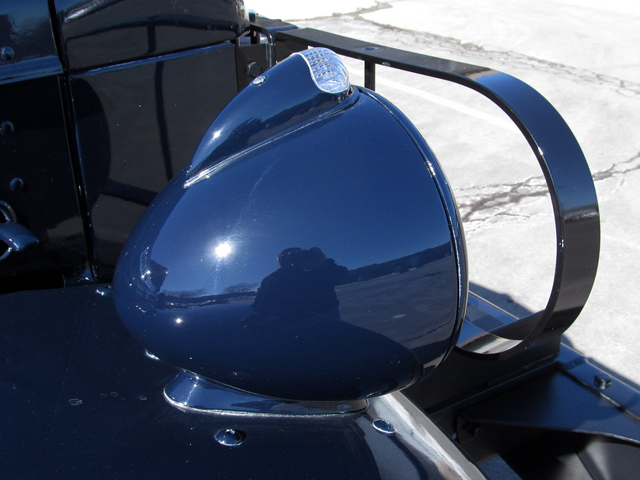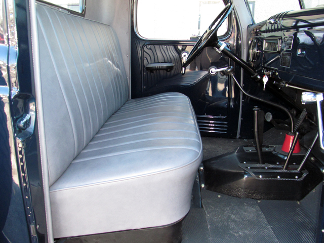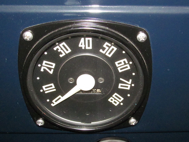 The interior is plain and functional, but the devil is in the details. The gray vinyl bench is comfortable, but even this tall truck can generate enough cornering force to send you sliding to the other side if you're not careful. Note the metal door panels, with the driver's side featuring a handy arm rest, and the headliner is correct fiberboard that fits superbly. The gauges are all rebuilt and fully functional, with the knobs underneath controlling the choke (C), lights (L), and heater blower (B). There's also a T-handle which is a locking hand throttle, critical when your truck can also be used as a powerplant with its PTO. No frills inside, but note the nicely finished rubber floors with very neatly made grommets around the control levers and a heel pad for the accelerator, which is a cool touch. Turn signals have been added for safety, too. The Mopar heater under the dash works quite well and the glove box labels showing the operation of the transfer case and details about its various top speeds have obviously been restored, although the speeds are probably somewhat different today (more on that in a moment).