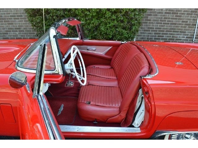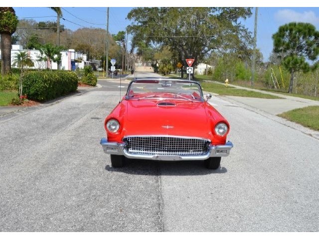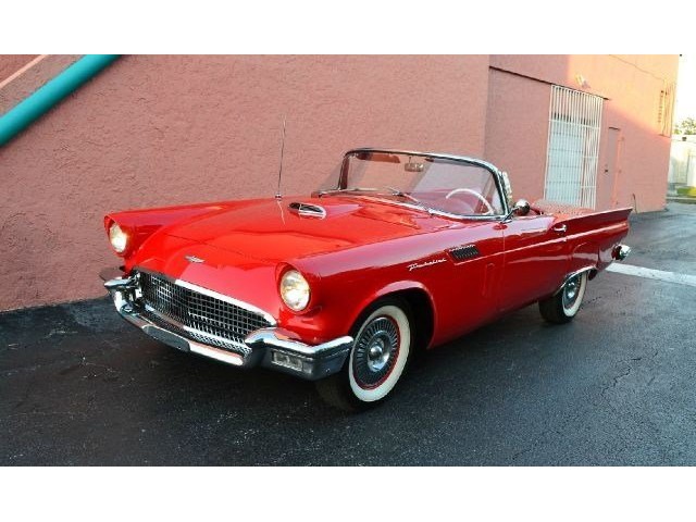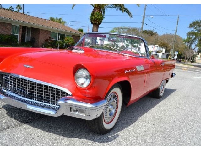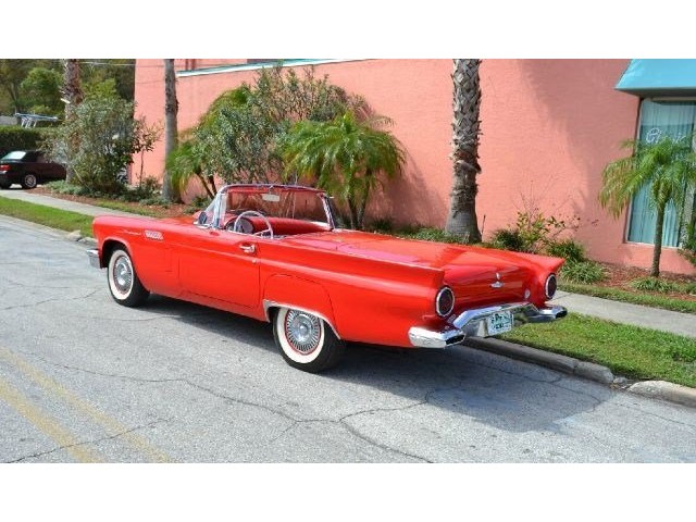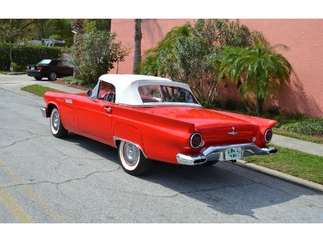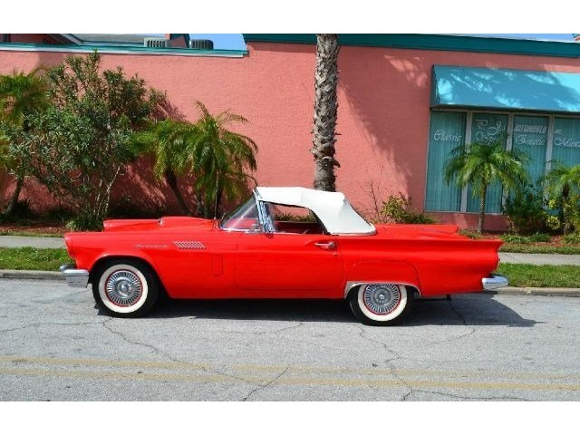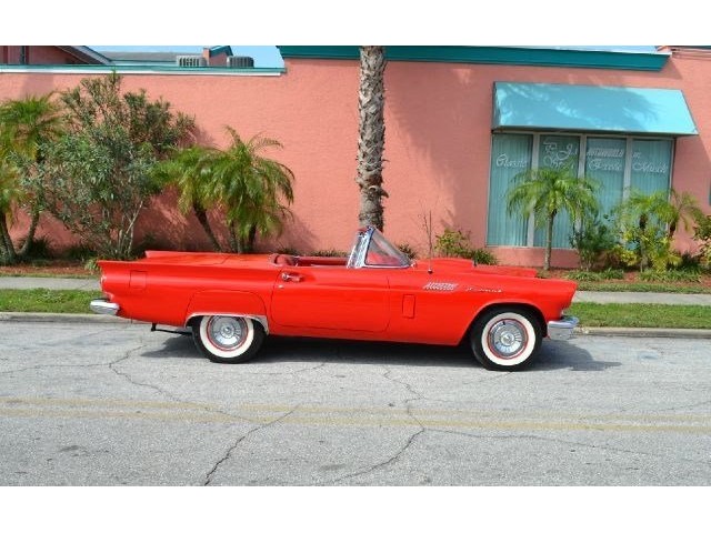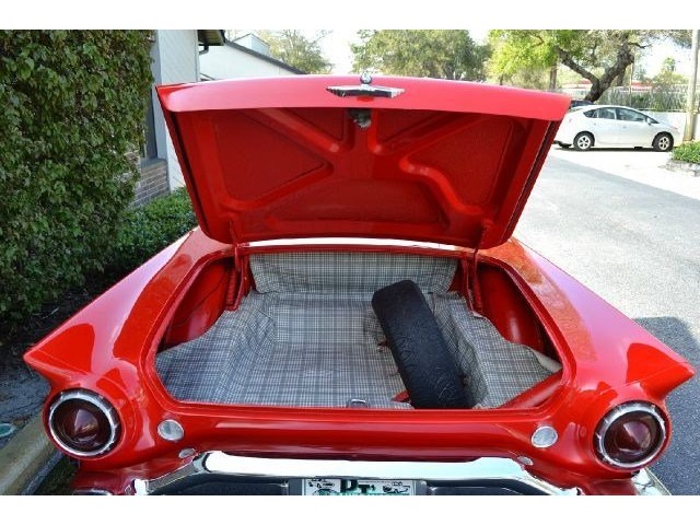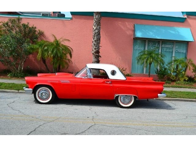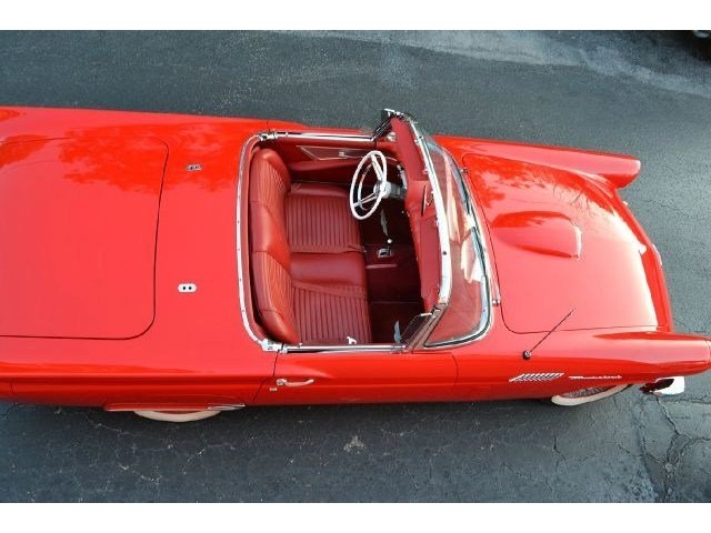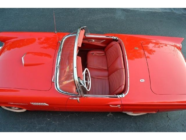 1957 Ford Thunderbird For Sale 312 Cubic inch V8 engine, two speed automatic transmission, 14" painted steel wheels with hubcaps, Coker Classic wide white wall radial tires, classic red exterior, cruise skirts, threw bumper dual exhaust, drivers chrome sport mirrors, reverse lights, wind deflectors, two tops, red vinyl interior, embroidered floor mats, vintage air, telescoping column. The first generation Thunderbird is one of the most iconic cars ever built. Watch the heads turn as this sweet sounding Thunderbird cruises by!!!