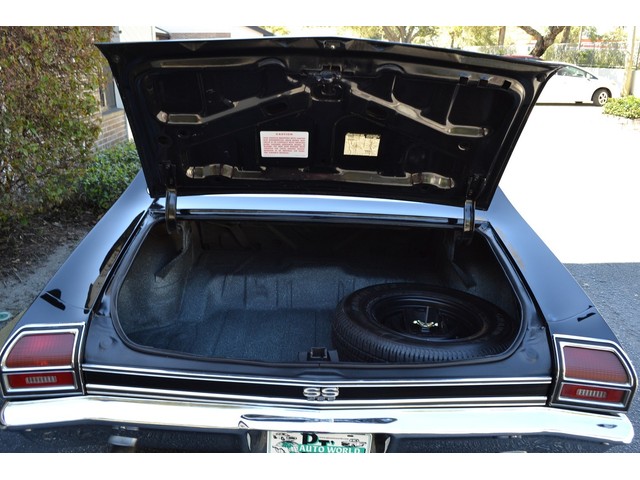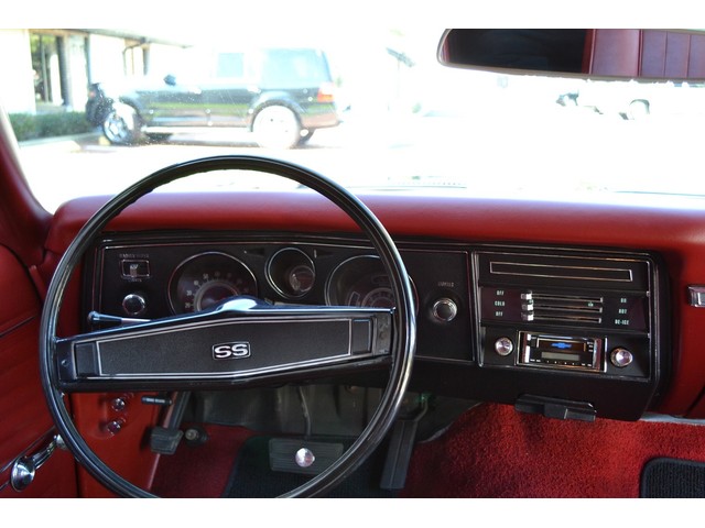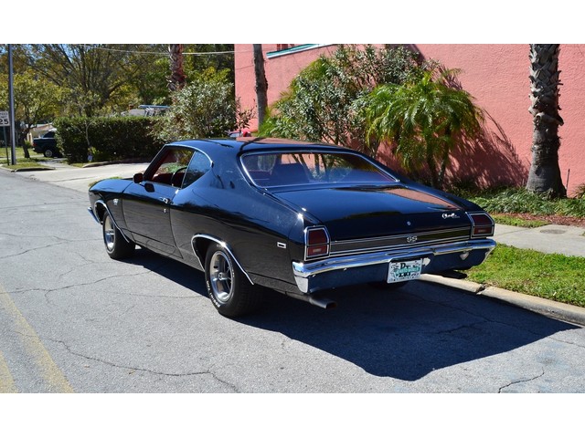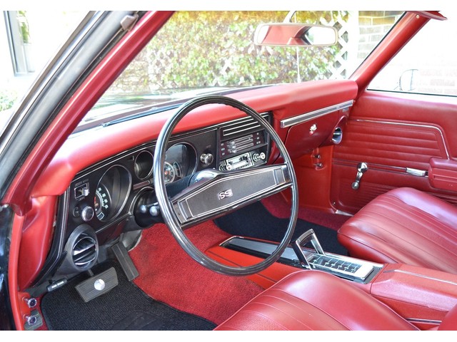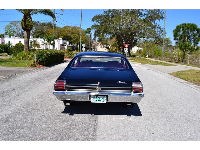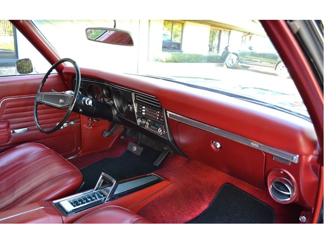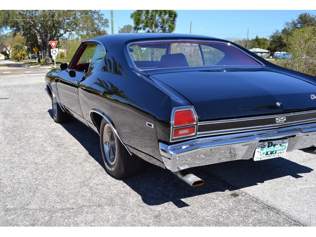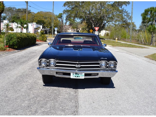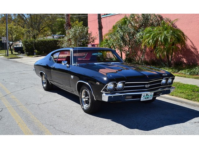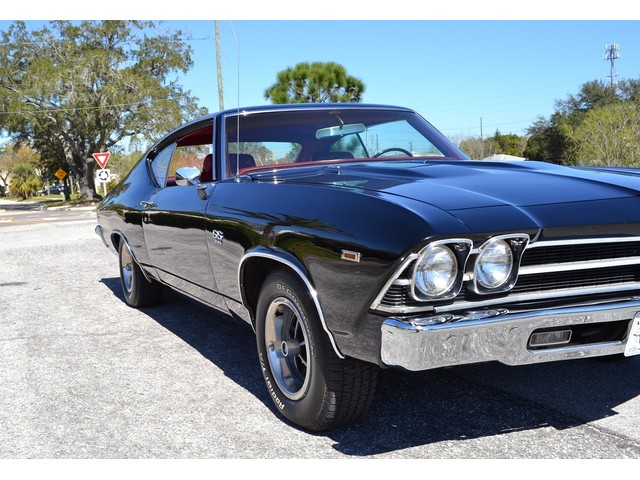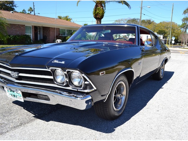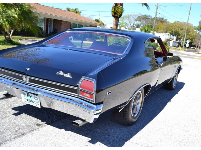 1969 Chevrolet Chevelle For Sale. 396 big block V8 engine, Holley dual feed 4 barrel carburetor, big tube headers, throaty dual exhaust, TH 400 automatic transmission, 12 bolt rear end, power steering, power disc brakes, 14" magnum 500 wheels with BF Goodrich Radial T/A tires, true code 10 Tuxedo black car, twin chrome sport mirrors, SS options, eye catching red bucket seat interior, console, tachometer dash, AM/FM/Cassette radio. Black and beautiful, this big block powered Chevelle looks and drives great. Don't miss it!!!