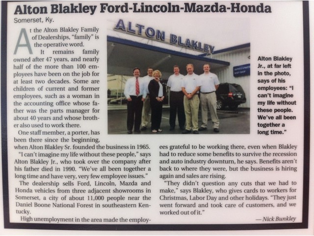 Alton E. Blakley, Sr., opened the doors to his newly acquired Ford franchise in 1965, offering the finest in Ford, Lincoln and Mercury vehicles.The Mazda franchise was added in 1979. We have consistently provided quality new and pre-owned vehicles for forty eight years. Our sales team works with each individual, matching families with their ideal vehicle. A wide range of finance options is available to suit most any buyer's needs and adding the Honda line-up. 1990 marked a turning point for the Alton Blakley Dealerships with the passing of owner Alton E. Blakley, Sr. Under the new ownership of his son, Alton E. Blakley, Jr., the quality, integrity and dedication of providing all the best to its consumers has continued to flourish in Pulaski County, Kentucky and beyond.  We are a Top 100 Best Dealer in the US, and Mr. Blakley was recently rewarded with the prestigious Ford Salute to Dealers Award.