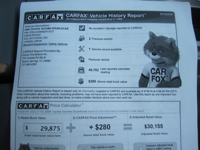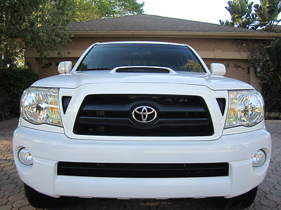 **************PLEASE WATCH THE VIDEO AT THE END OF THIS DESCRIPTION IF YOU DON'T WANT TO READ ALL OF THIS:)*********ABSOLUTELY GORGEOUS 2008 TOYOTA TACOMA DOUBLE CAB SR5 4X4 TRD SPORT PACKAGE, ELDERLY OWNED, ALWAYS GARAGED  SINCE BOUGHT BRAND NEW...CLEAN CARFAX, LOOKS TO HAVE BEEN ALWAYS DEALER SERVICED, NEVER HAS BEEN SMOKED IN AND LOOKS TO HAVE NEVER EVEN BEEN EATEN IN, BOOKS AND MANUALS, ALL THE KEYS (3) AND KEY FOBS, EVEN THE KEY CODE NUMBER. THIS DOUBLE CAB TACOMA SR5 4X4 LOOKS FANTASTIC INSIDE AND OUT, IT IS IN EXCELLENT CONDITION AND IT IS JUST LIKE "BRAND NEW"... IT IS A GORGEOUS COLOR COMBINATION, AND THE FACTORY PAINT LOOKS AND SHINES LIKE NEW. THE INTERIOR IS ALSO LIKE NEW, ALL THE CARPET LOOKS BRAND NEW, AND THE SEATS FRONT AND BACK, AND THE DASH, AND DOOR PANELS, I TOOK SOME VERY CLOSE UP PICTURES SO YOU CAN SEE HOW CLEAN IT IS. THERE IS NOT A MARK ON ANYTHING. I EVEN TOOK A PICTURE OF THE UNDERNEATH OF THIS TRUCK, IT LOOKS TO HAVE NEVER BEEN IN THE WOODS, MUD, SALT, IT REALLY IS IN IMMACULATE CONDITION. THE SPARE TIRE HAS NEVER BEEN ON THE GROUND. THIS WAS OWNED BY AN ELDERLY GENTLEMAN, NO WORK BOOTS IN THIS TRUCK. THE CIGARETTE LIGHTER NEVER HAS BEEN USED..., BED LINER, FACTORY TIE DOWNS, TOW HITCH. THIS BEAUTIFUL TACOMA RUNS AND RIDES AND HANDLES JUST LIKE IT DID NEW, EVERYTHING WORKS FANTASTIC. YOU WILL ALSO GET THE VERY NICE 17" FACTORY ALLOY WHEELS WITH LIKE "BRAND NEW"BIG MICHELIN TIRES THAT REALLY MAKE THIS TRUCK LOOK AMAZING... I AM GOING TO SELL IT TO THE HIGHEST BIDDER AT THE END OF THE AUCTION, AFTER THE LOW RESERVE HAS BEEN MET...UNLESS IT IS SOLD BEFORE THEN. IF YOU HAVE ANY QUESTIONS PLEASE CALL ME...JACK 727-460-4283 OR CAROL 727-798-7161 OR EMAIL US.  I DO HAVE THIS TRUCK FOR SALE LOCALLY AS WELL. THANKS GOD BLESS YOU AND HAVE A GREAT DAY...THIS IS TRULY A (DIVINE FIND)...MAY A LITTLE MORE MILES ON IT BY THE END OF THE AUCTION