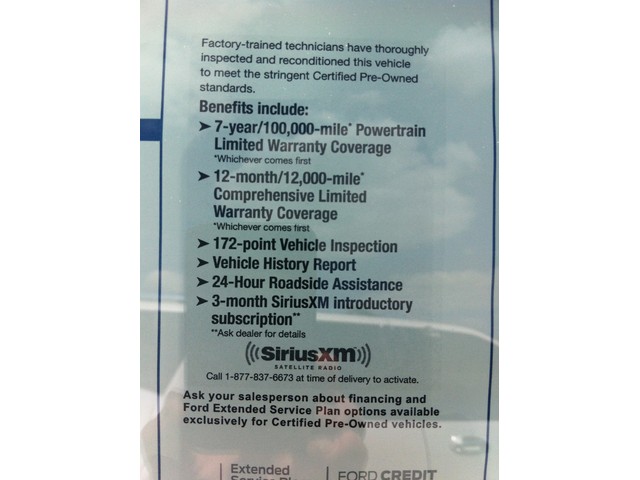Ford Certified Pre-Owned Warranty 1 Year 12,000 Mile Comprehensive Warranty 7 Year 100,000 Mile Powertrain Warranty 24 hour Roadside Assistance with Trip interruption Many More Benefits see Photos