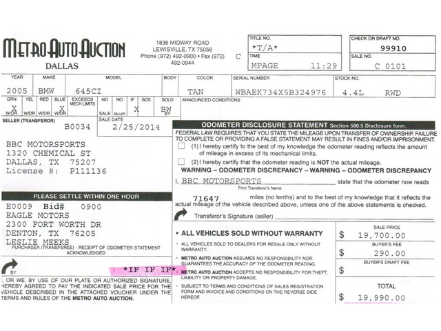 *  Texas residents pay 6.25% sales tax and registration/inspection fees.  Out of state buyers may register and pay applicable taxes in their home state.