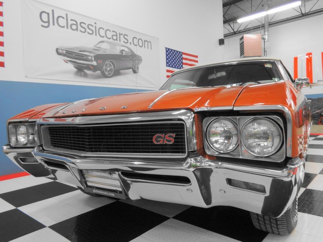 The Buick GS350 and GS400 both rested on the 112-inch wheelbase intermediate coupe platform. Inside, the GS350 was trimmed in similar fashion to the Skylark Custom. The exterior had an aggressive and muscular appearance and was coded as a Skylark Custom although it was more related to the GS400. On the front fenders were finned simulated air intakes, bright wheelhouse molding was used, and a lower body paint accent stripe replaced the bright molding. On the center of the deck lid was a GS 350 plaque. In the front grille was more identification. The rear fenders and door panels had GS monograms.